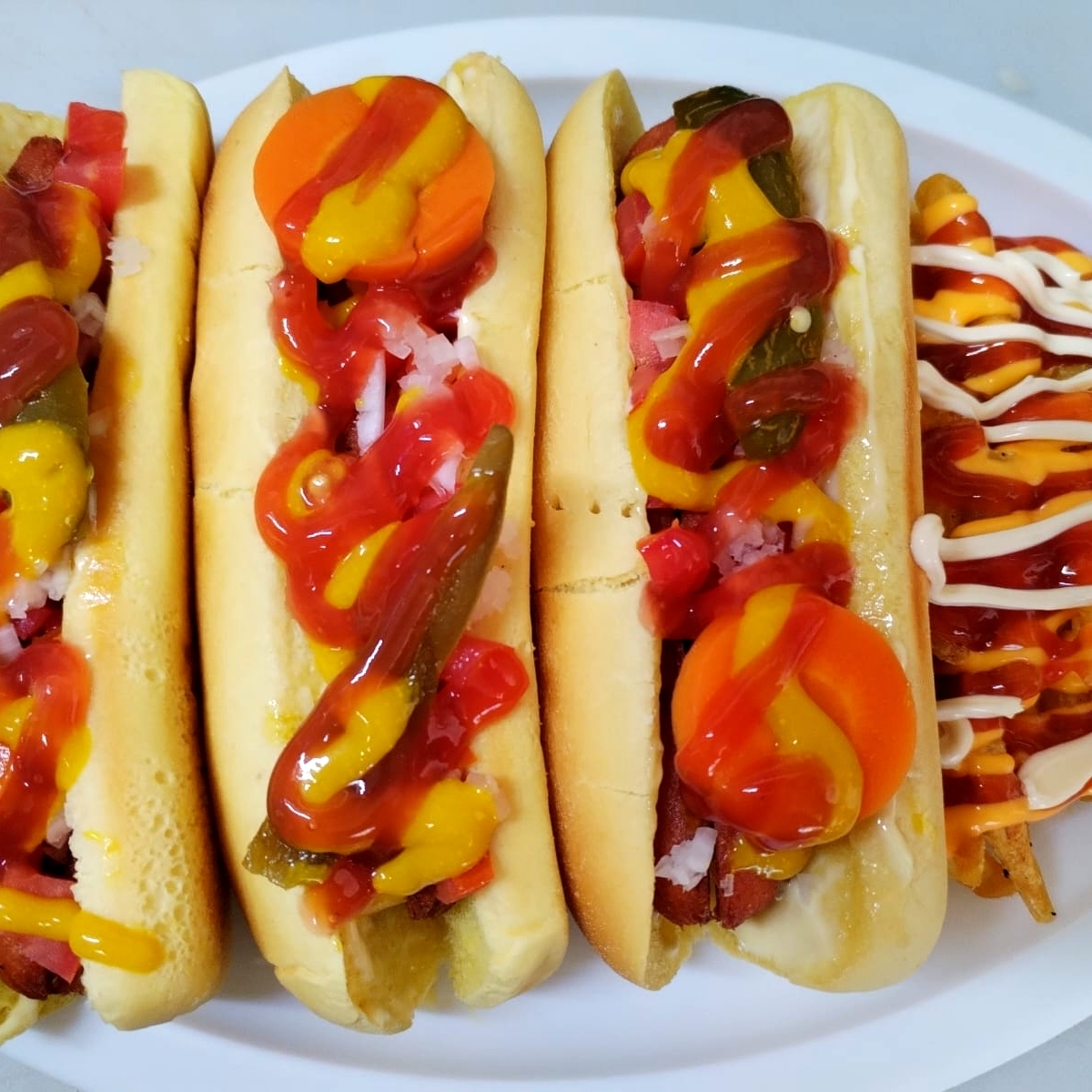 3 PZAS DE PAN,3 PZAS DE SALCHICHA,MAYONESA,JITOMATE Y CEBOLLA,PAPAS A LA FRANCESA.