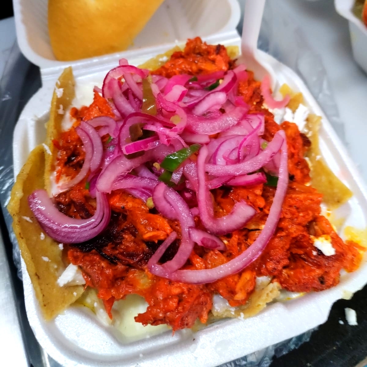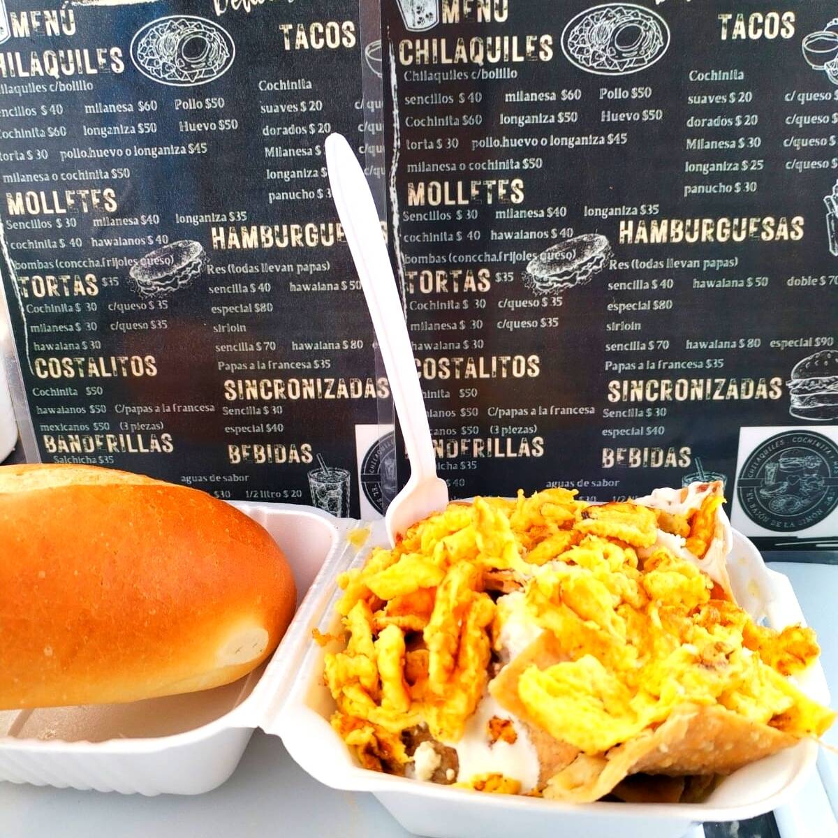 TOTOPOS BAÑADOS EN SALSA VERDE, COCHINITA PIBIL ,CREMA,QUESO DOBLE CREMA,CEBOLLA BLANCA,Y UNA PIEZA DE BOLILLO.