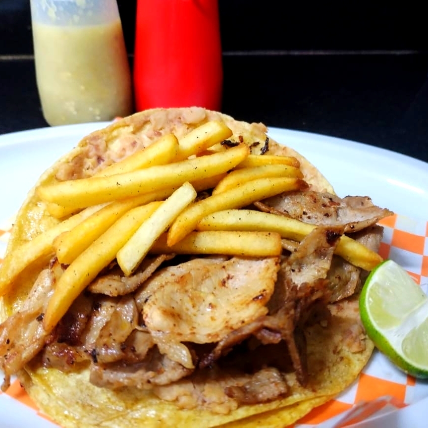 DOBLE TORTILLA DE MAIZ,FRIJOLES BAYOS REFRITOS,LONGANIZA,PAPAS A LA FRANCESA.