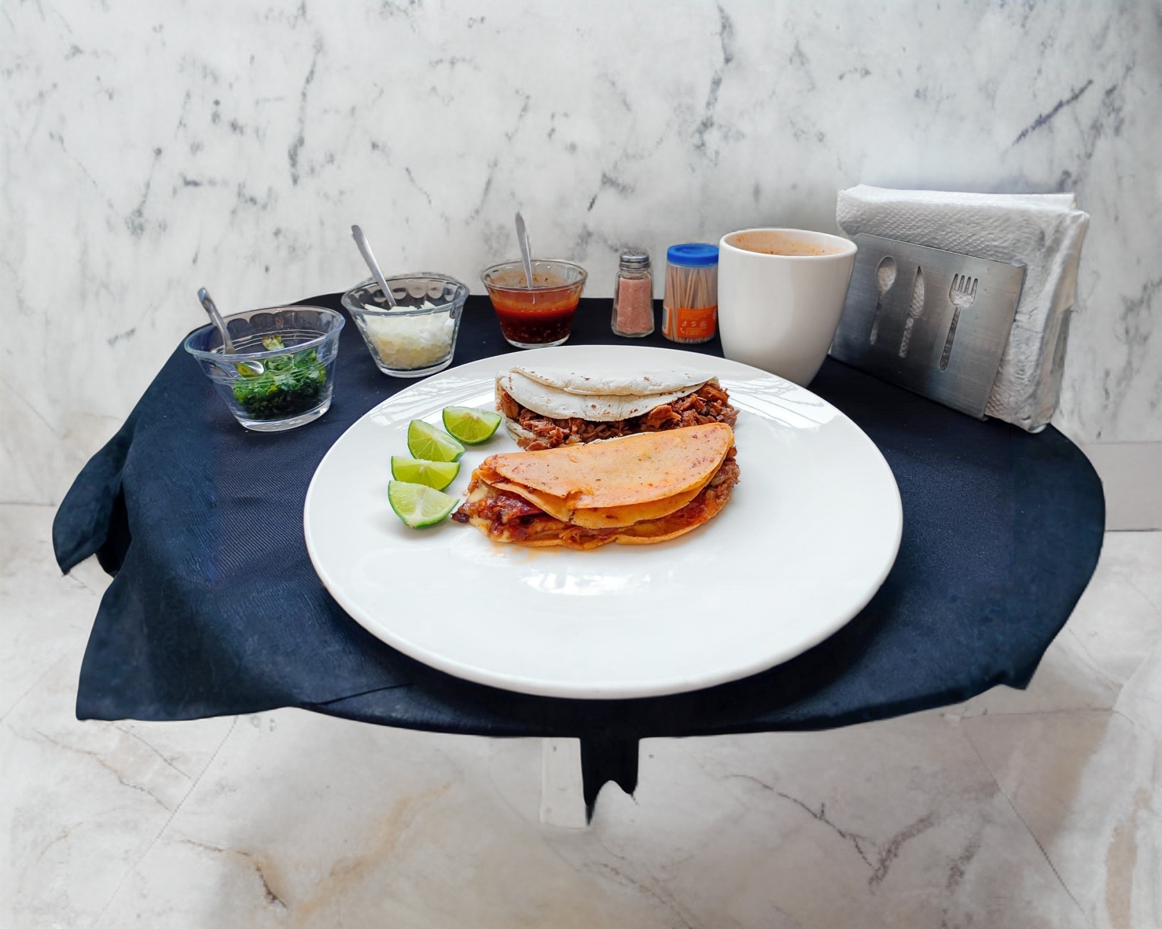 1 Quesabirria con Doble tortilla de maiz con 70 gramos de carne y con 20 gramos de queso Oaxaca, la carne es a escoger, incluye cebolla, limones y salsa.