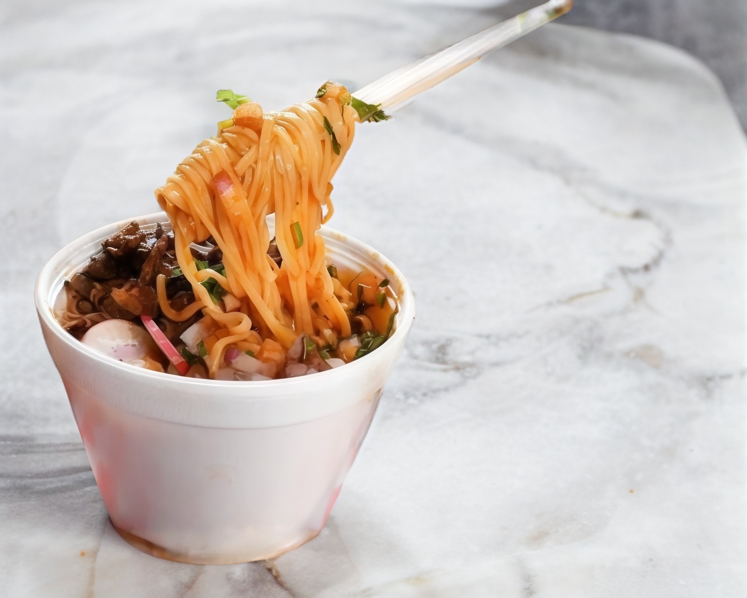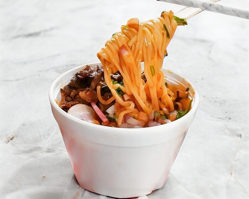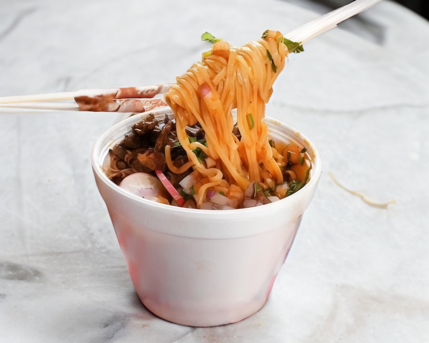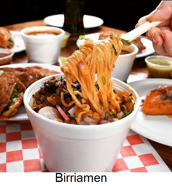 Medio Litro de Birriamen , incluye: 1 Porción de 42.50gr de tallarines instantáneos, cilantro, salsa roja, 100gr de carne a elegir ( Surtida, Maciza, Chambarete, Costilla), acompañado de cebolla, limones.