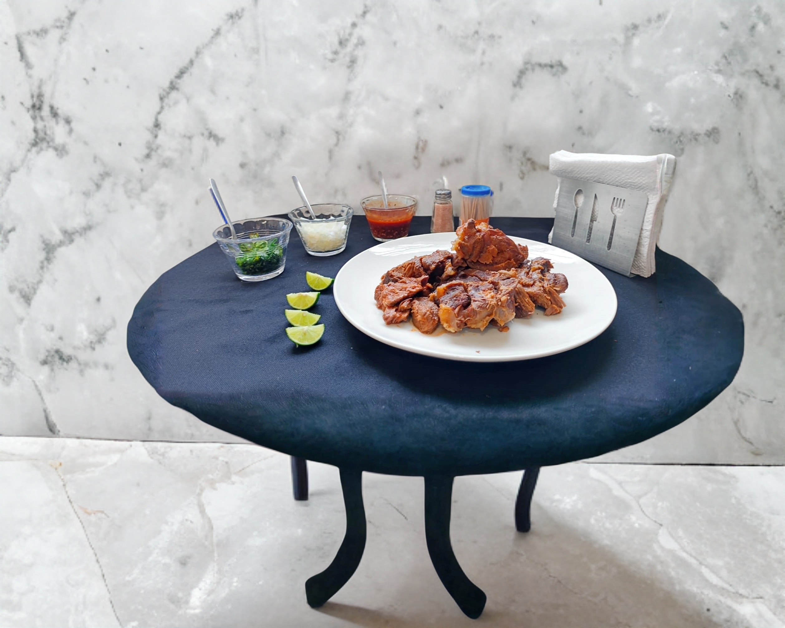 Taco con doble tortilla grande con 70 gramos de carne y además la carne es escoger, chambarete, maciza, costilla o surtida las verduras, limones y salsa van aparte.