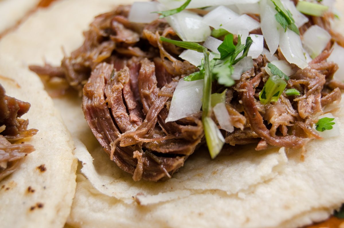 Carne a elegir. Barbacoa, costilla, maciza, campechano, falda y pescuezo, con cebolla, cilantro y salsa roja o verde.