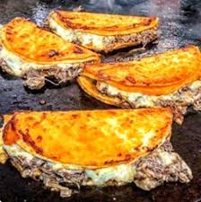 Carne de birria con queso oaxaca fundido a la plancha.