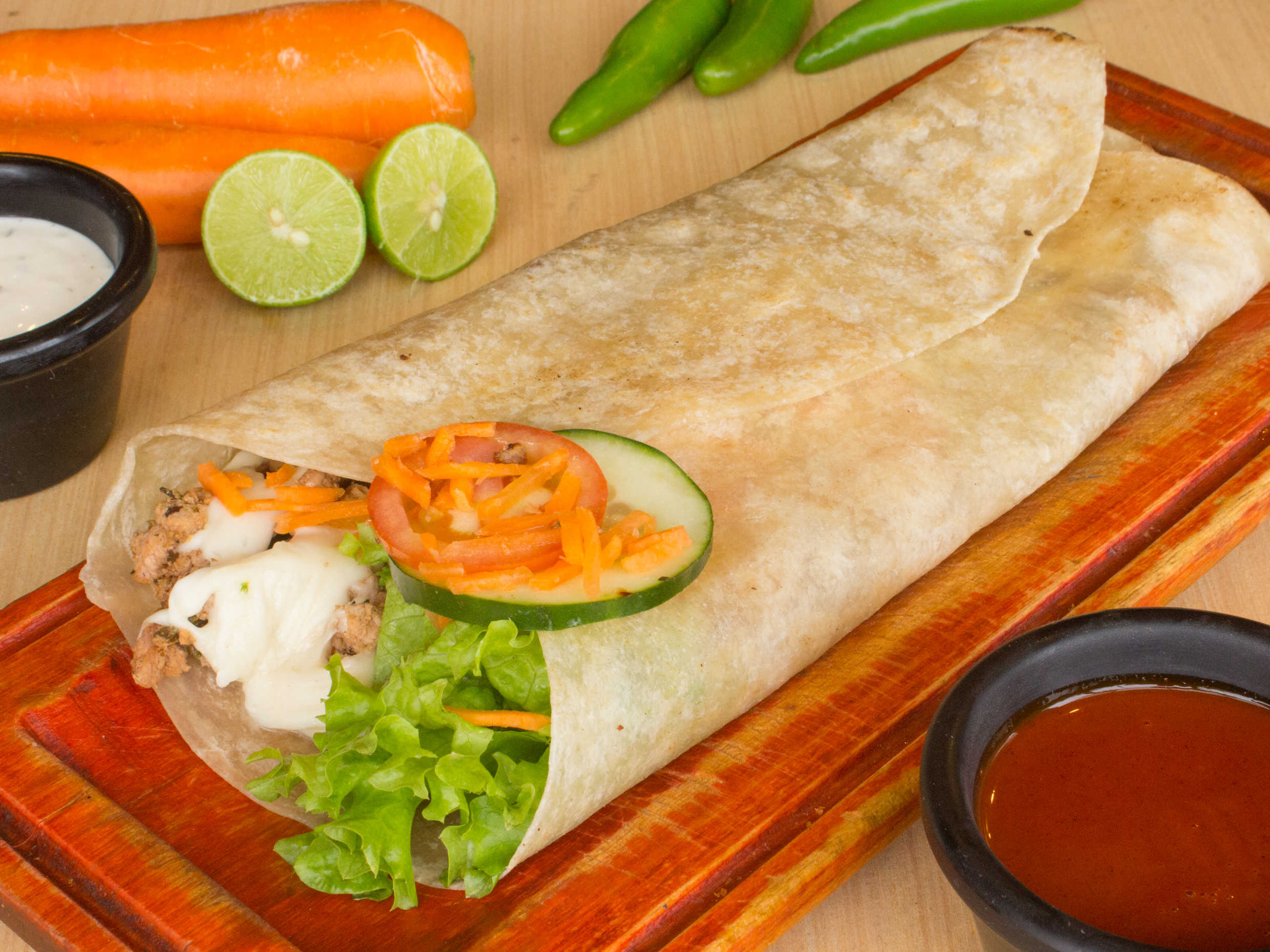 Carne kebab a elegir, lechuga, jitomate, cebolla, pepino y zanahoria envuelto en tortilla de harina de 30 centímetros con queso Oaxaca.