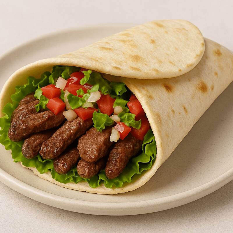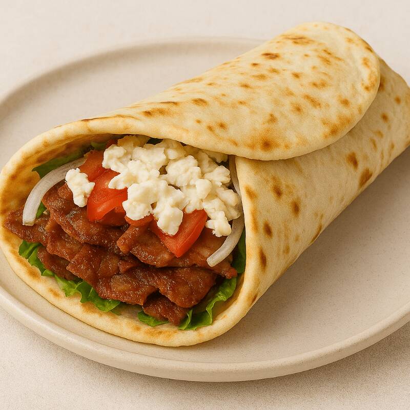 Carne kebab a elegir, lechuga, jitomate, cebolla, pepino y zanahoria envuelto en pan pita artesanal con queso Oaxaca.
