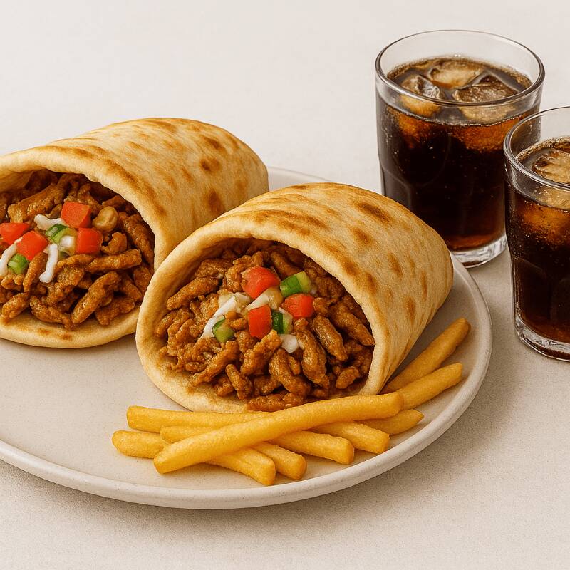 1 kebab a elegir, 200g de papas, 1 bebida a elegir.