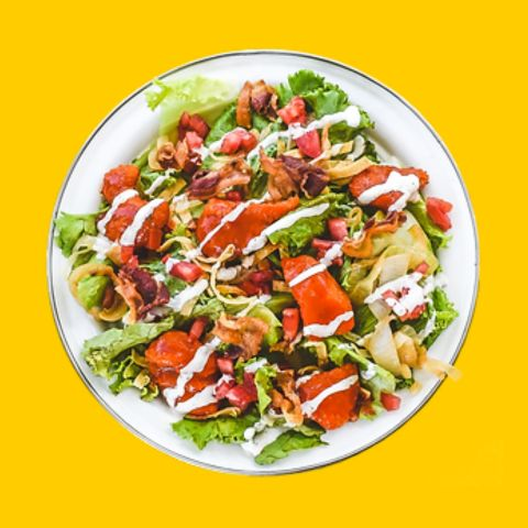 Ensalada con mix de lechugas, jitomate, pepino, pimiento, cebolla, mix de semillas y pan pita dorado. (se acompaña de aderezo ranch aparte)