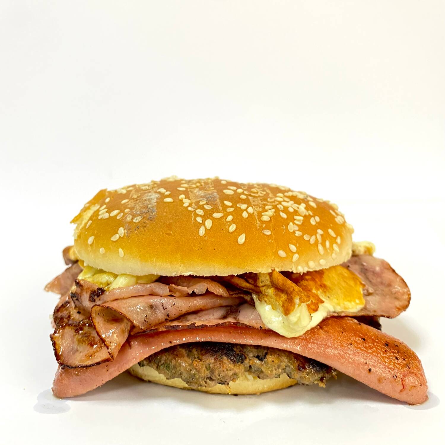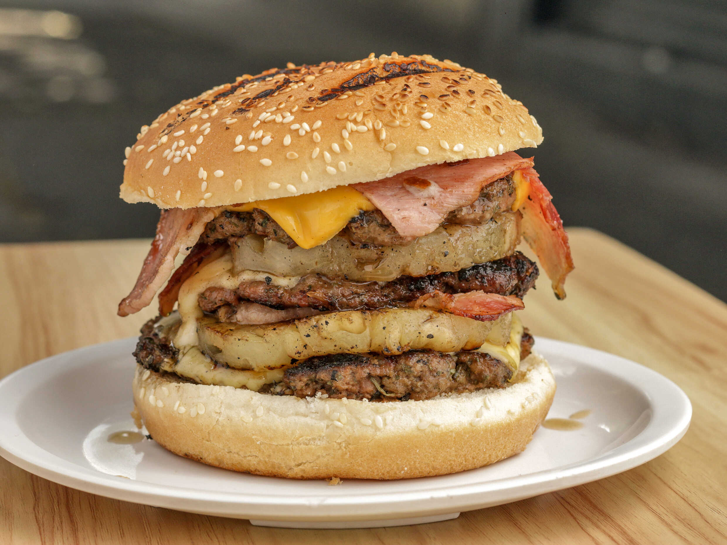 Deliciosa Hamburguesa de Triple Carne de Res, Triple Tocino, Triple Queso y Doble Fruta.
