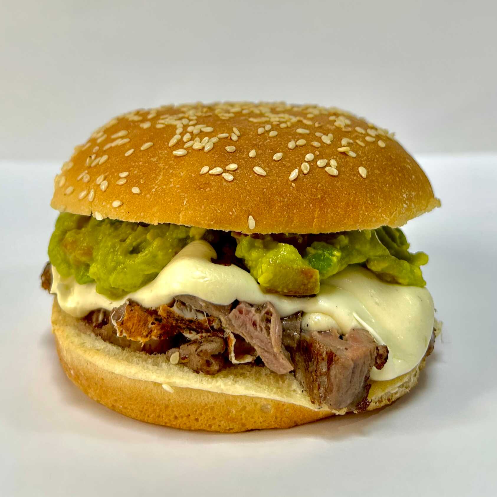 DELICIOSA HAMBURGUESA DE ARRACHERA, QUESO Y GUACAMOLE.