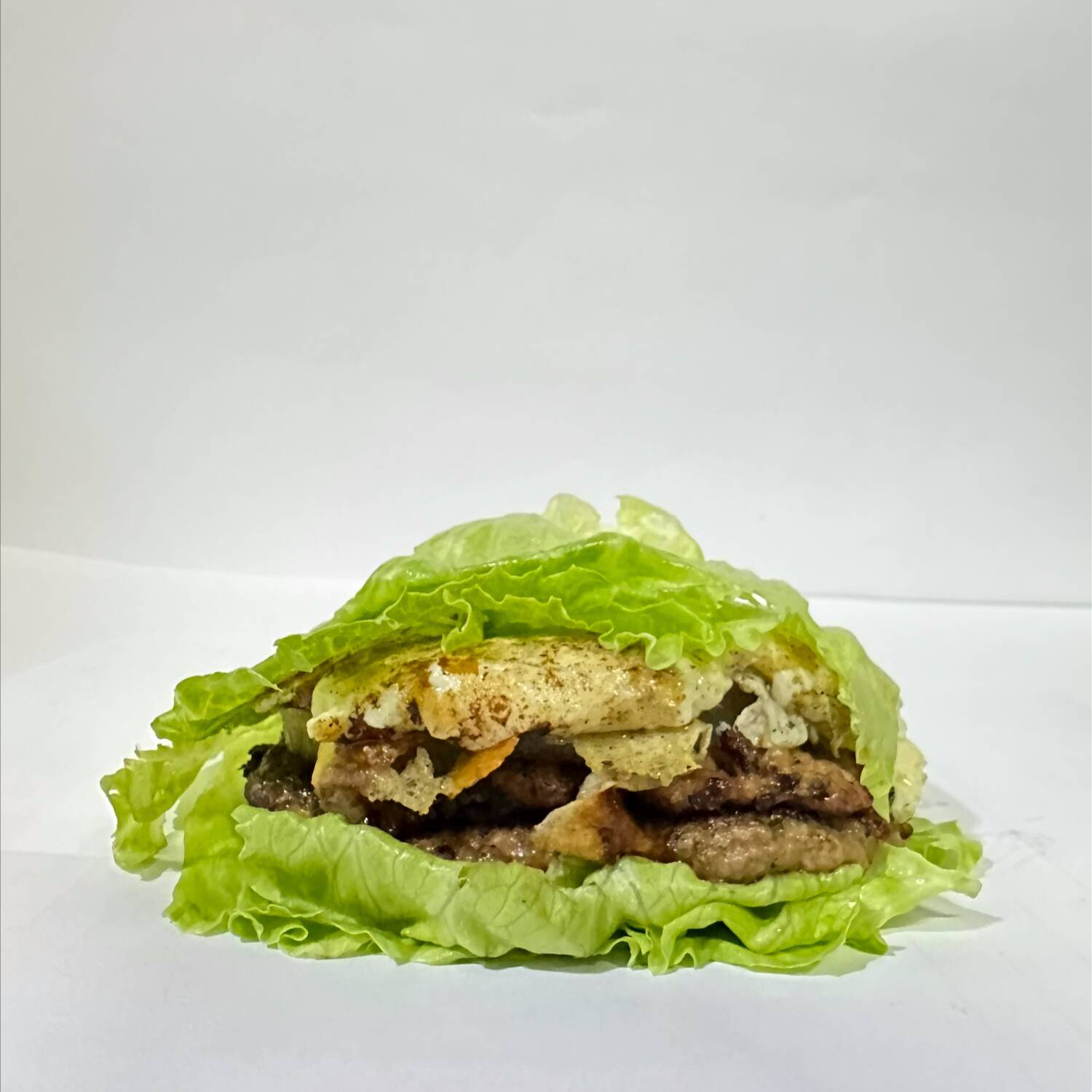 DELICIOSA HAMBURGUESA DE DOBLE CARNE DE RES, QUESO Y FRUTA. ENVUELTA EN LECHUGA