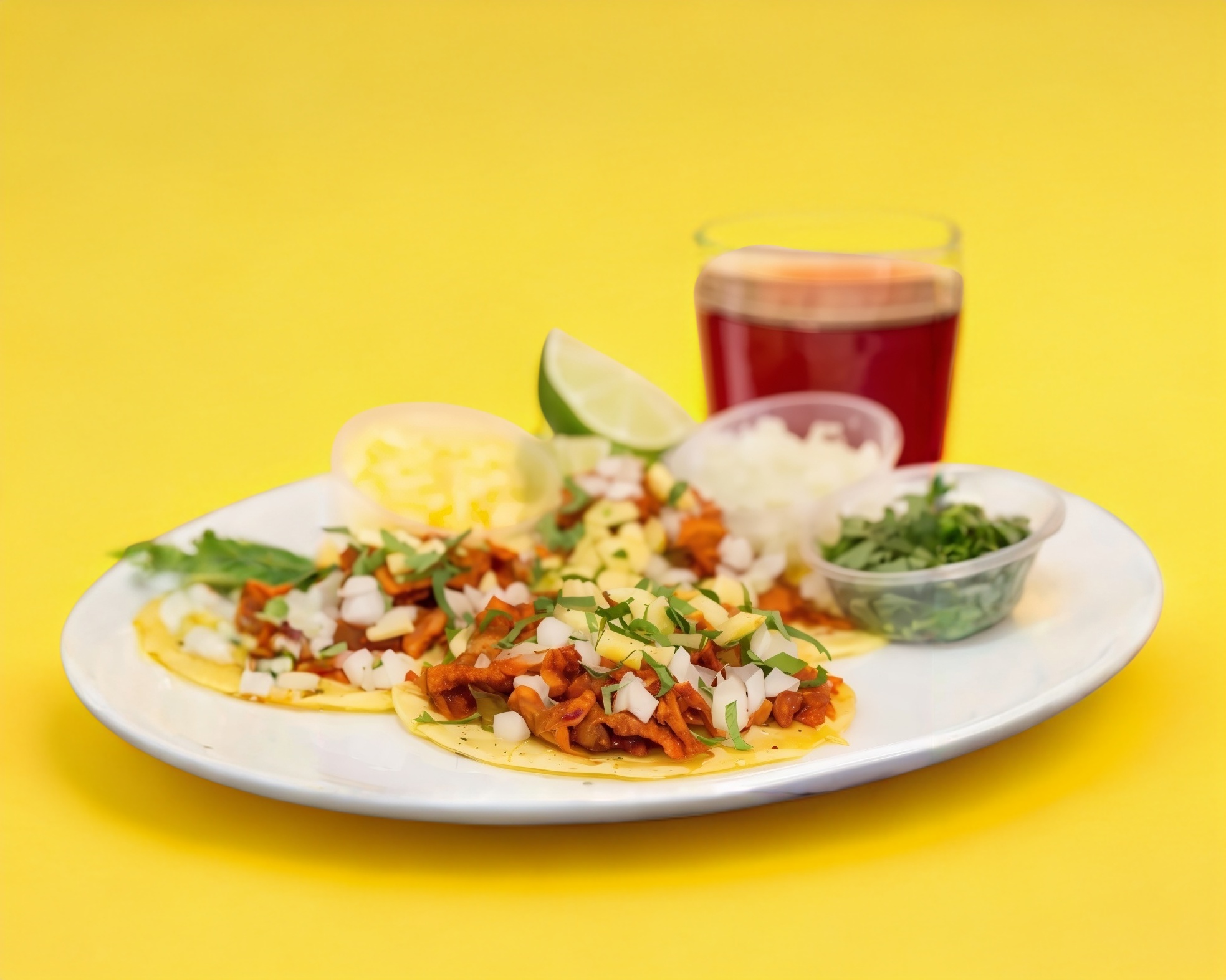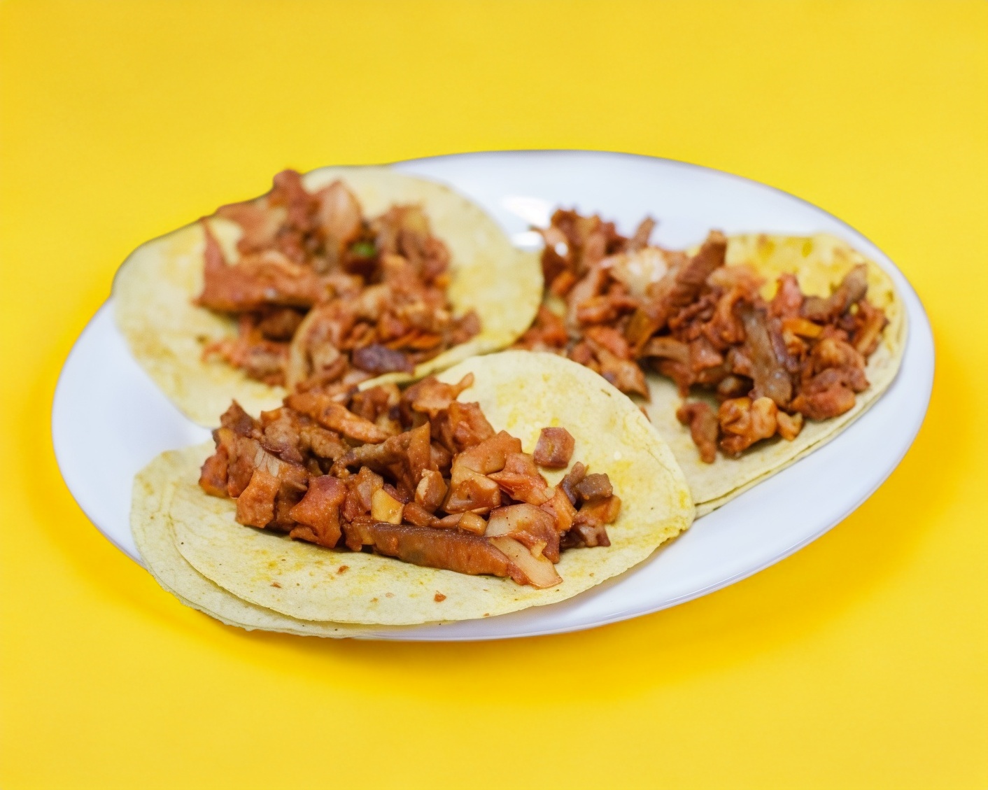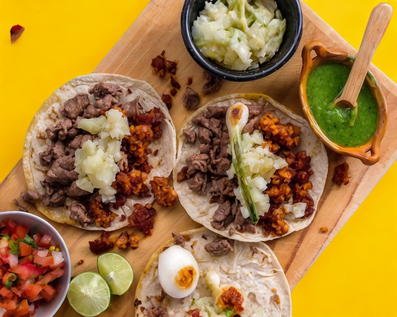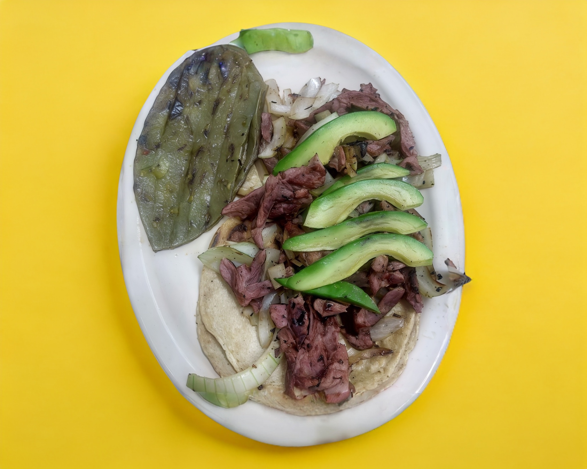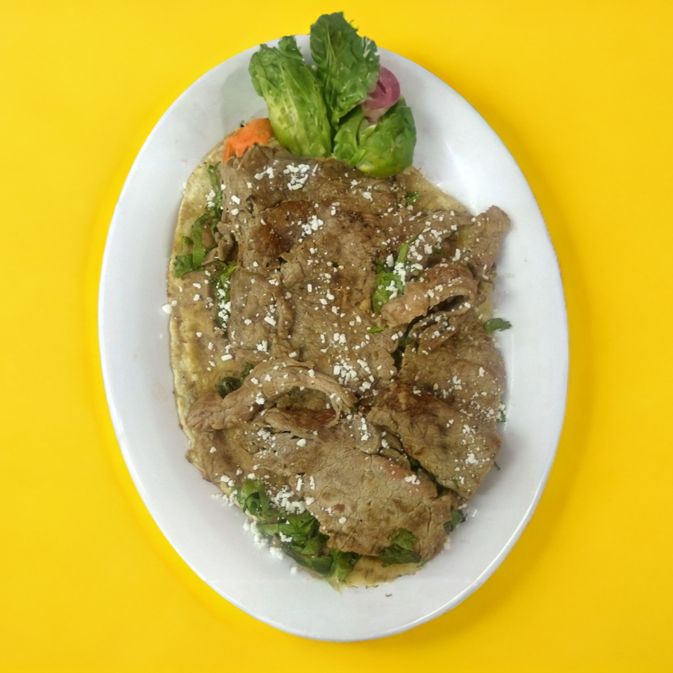Jugosa carne servido en 4 tortillas grandes con aguacate, cebolla y jitt.