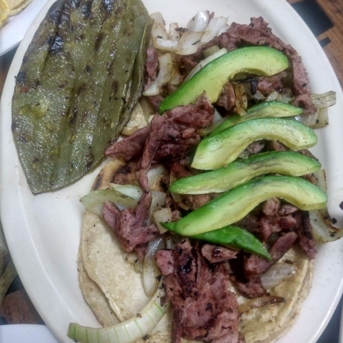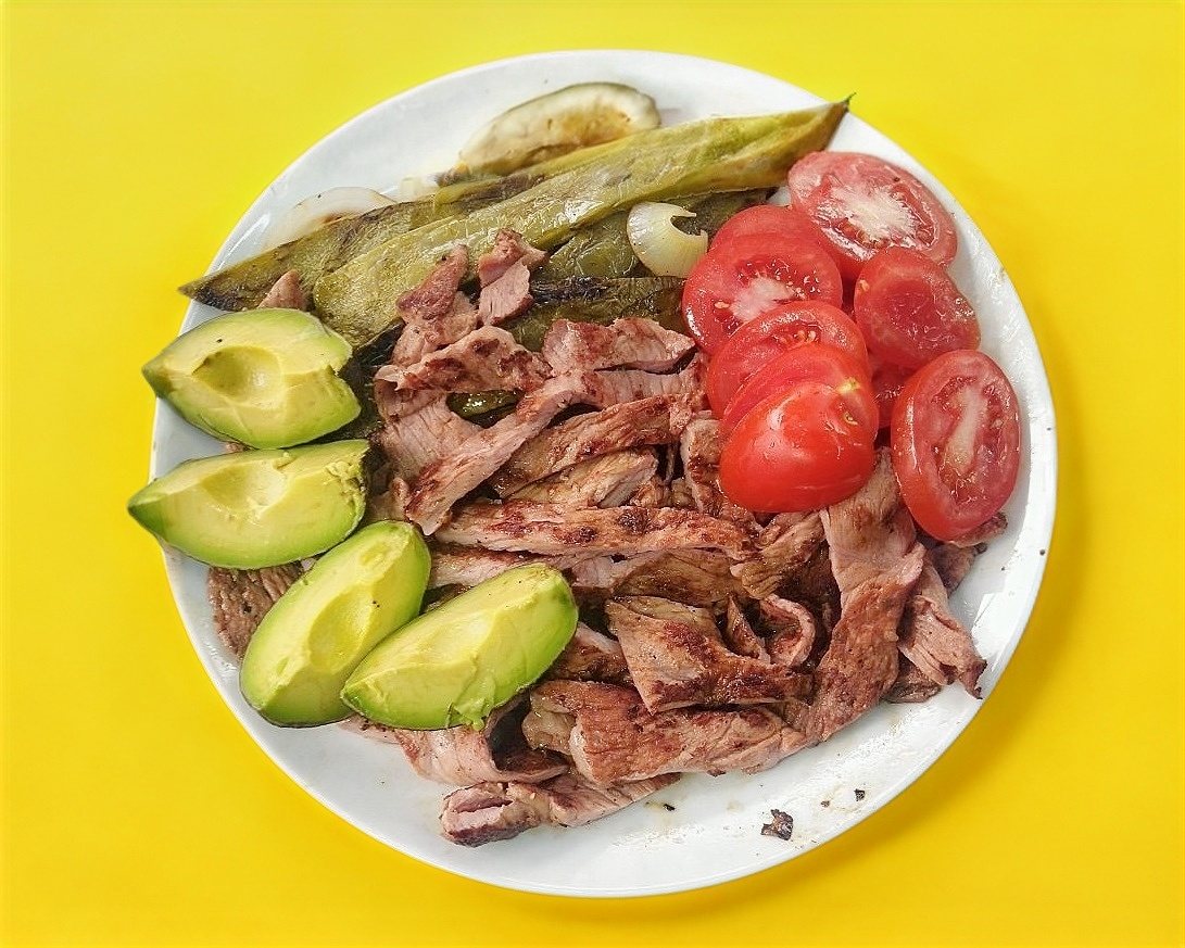 Arrachera jugosa con aguacate, jitomate y chiles en vinangre.