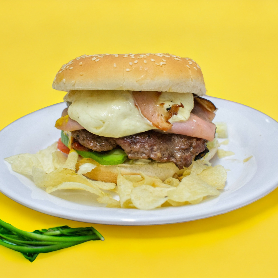 1 Hamburguesa especial con queso, tocino, jamón, lechuga y jitomate.