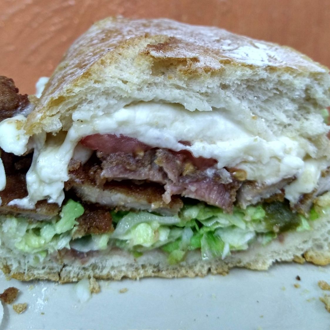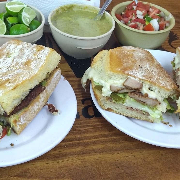 Bolillo, suadero con queso, aguacate, jitomate y chile.