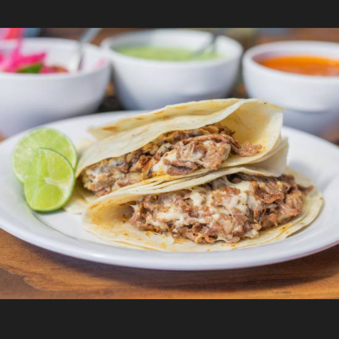 2 Tacos (pastor) con queso, +frijoles charros. "Promoción limitada"