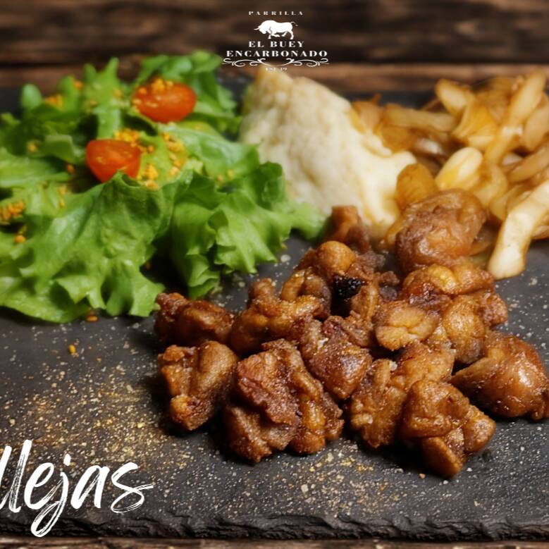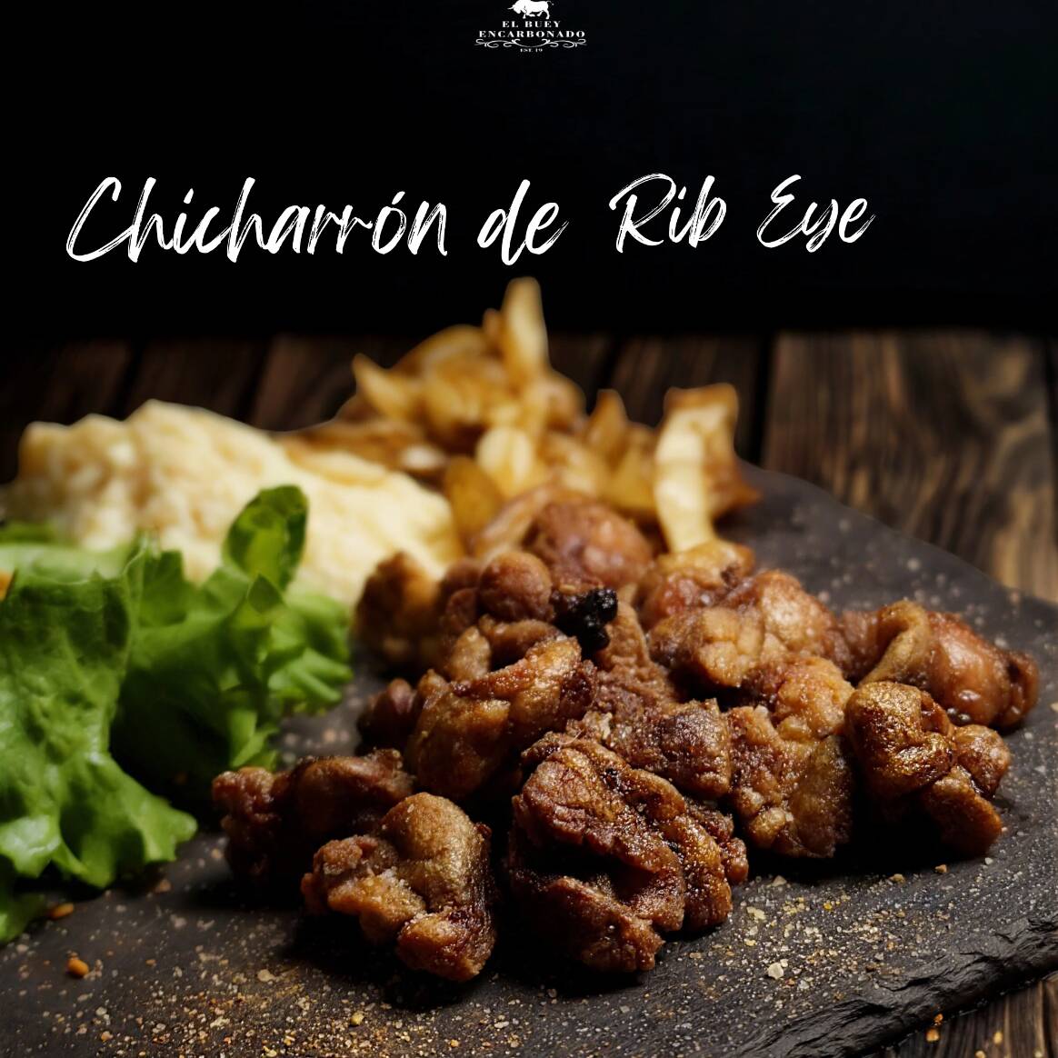 Chicharrón de rib eye, arrachera, mollejas, queso fundido (400gr crudo), ensalada de lechuga, guacamole, limón y cebollitas cambray.