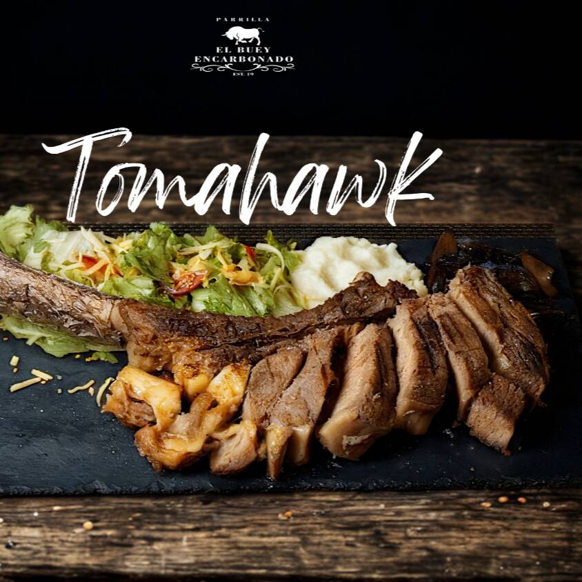 Tomahawk (1.4kg crudo), ensalada de lechuga, guacamole, limón y cebollitas cambray.
