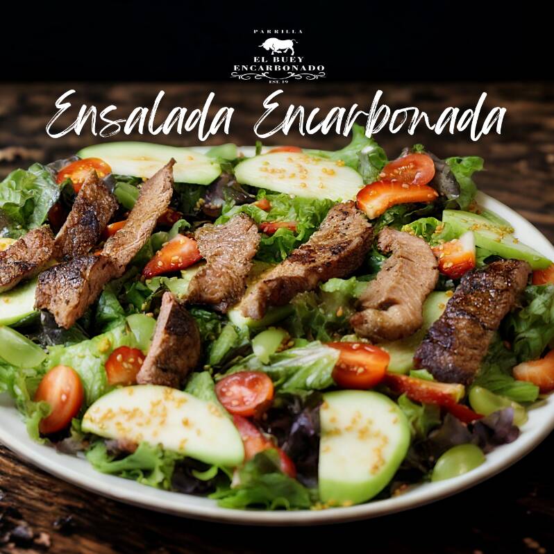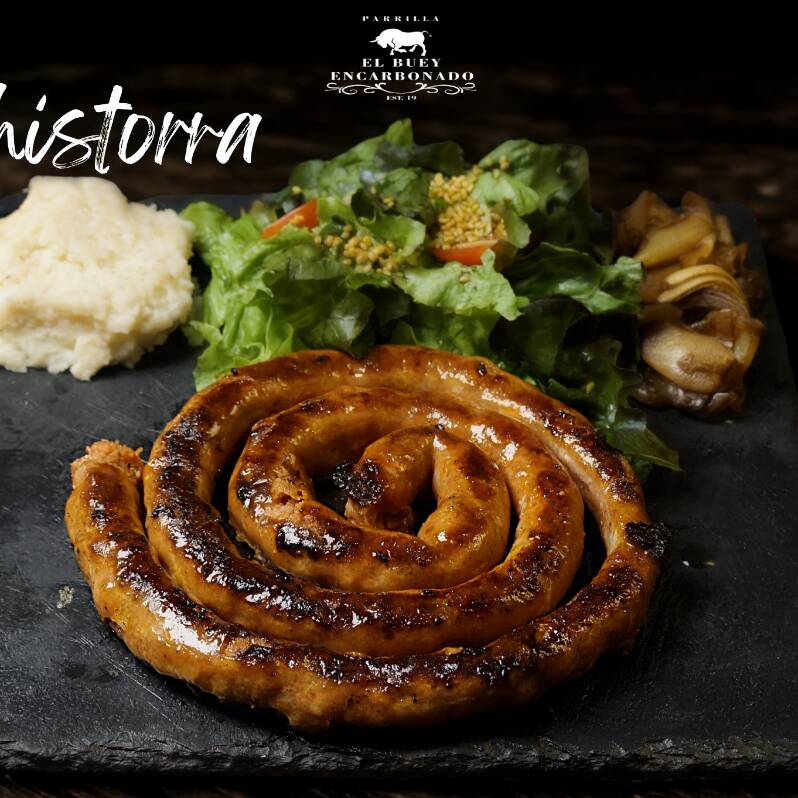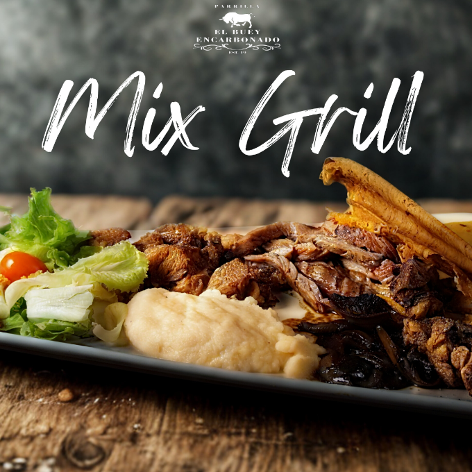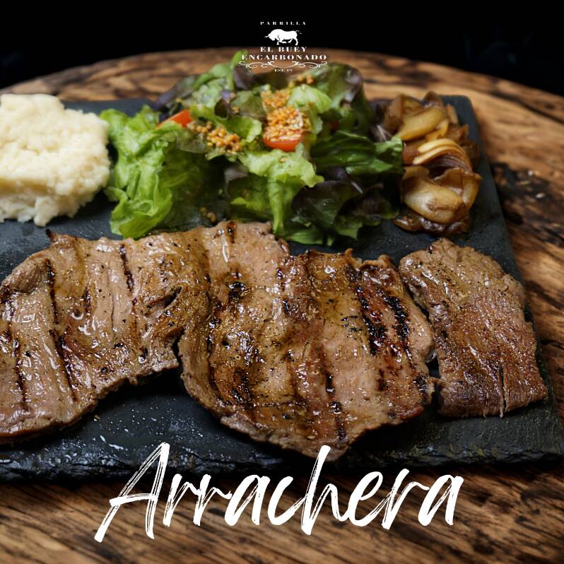 Rib eye (250grs crudo), arrachera, chorizo o chistorra, gratinada ensalada de lechuga, guacamole y cebollitas cambray.