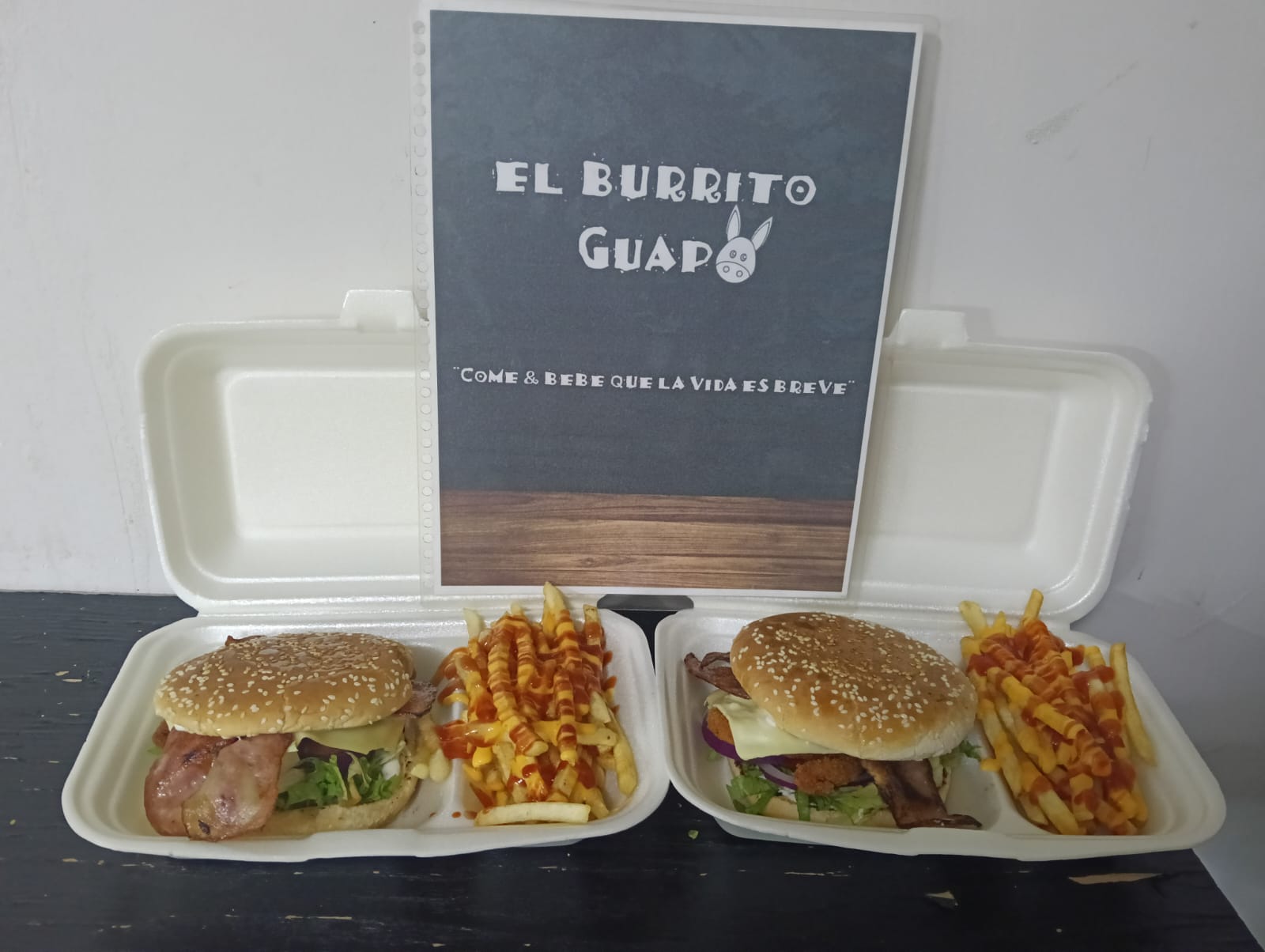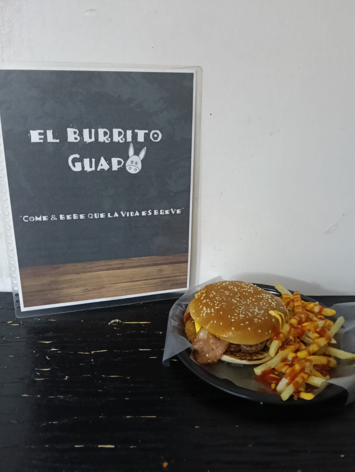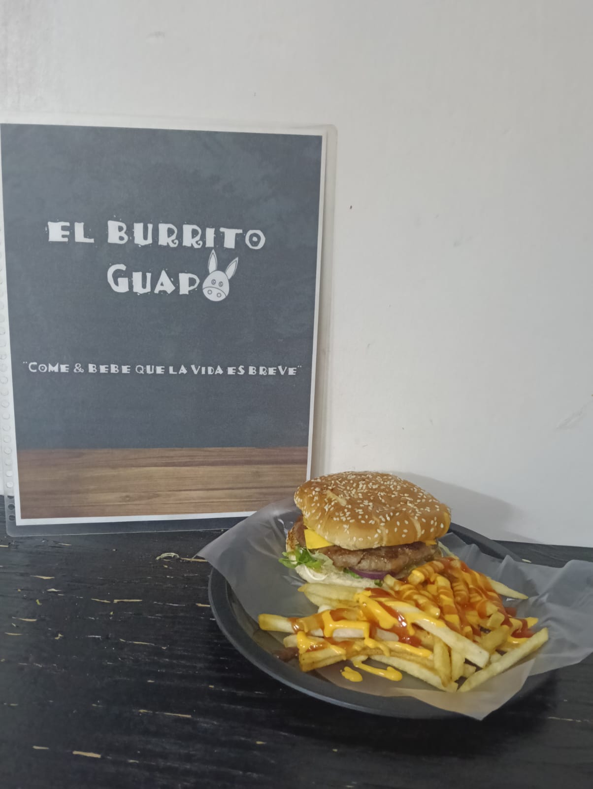 Deliciosa hamburguesa de carne de res (receta de la casa), tocino, queso manchego, guacamole, lechuga, jitomate y cebolla con adición de papas a elección.