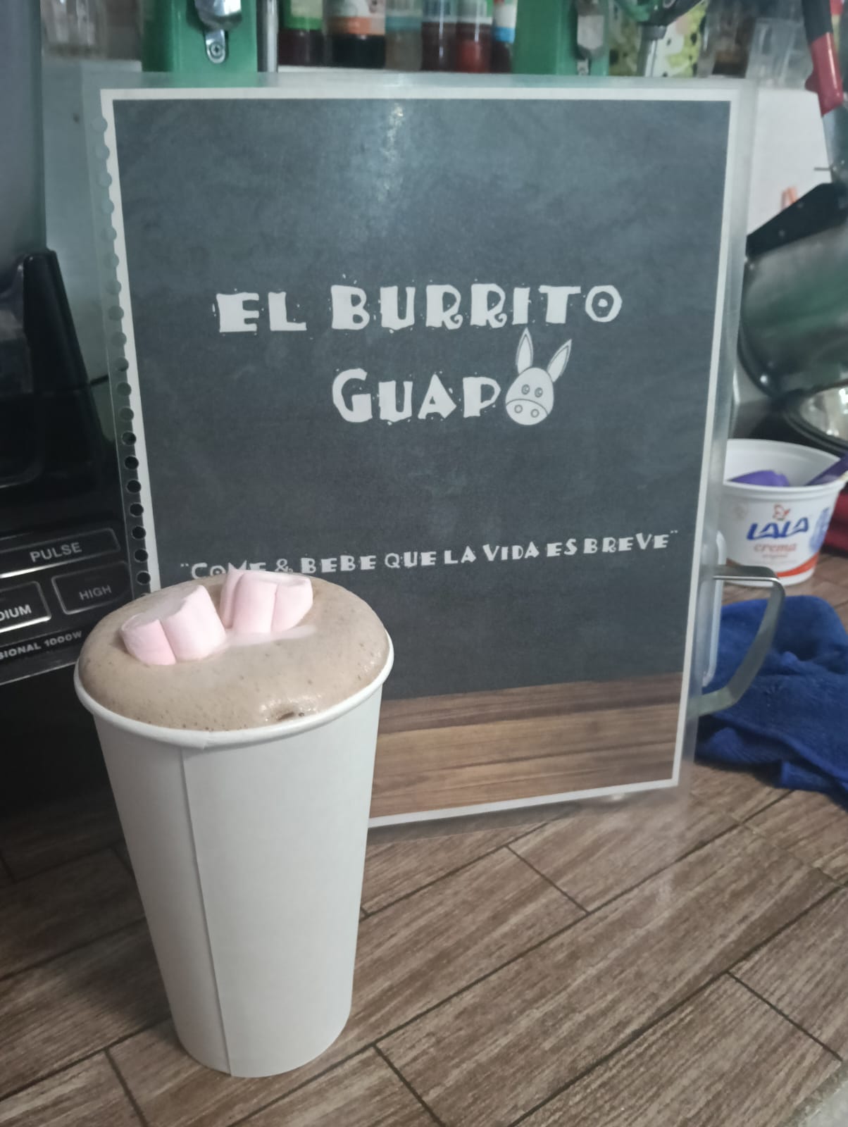 Burrito de pollo, queso oaxaca, frijol, pimiento morrón y cebolla asada.