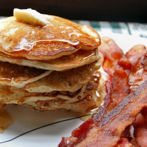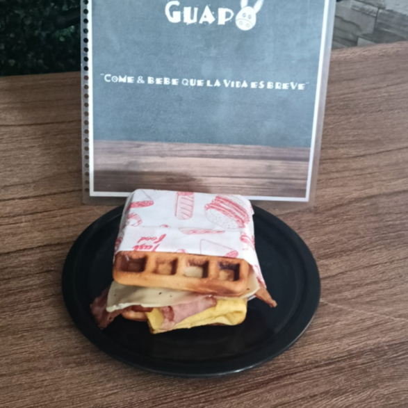 Pan waffle acomáñado de Huevo, Queso manchego, Queso americano y Tocino