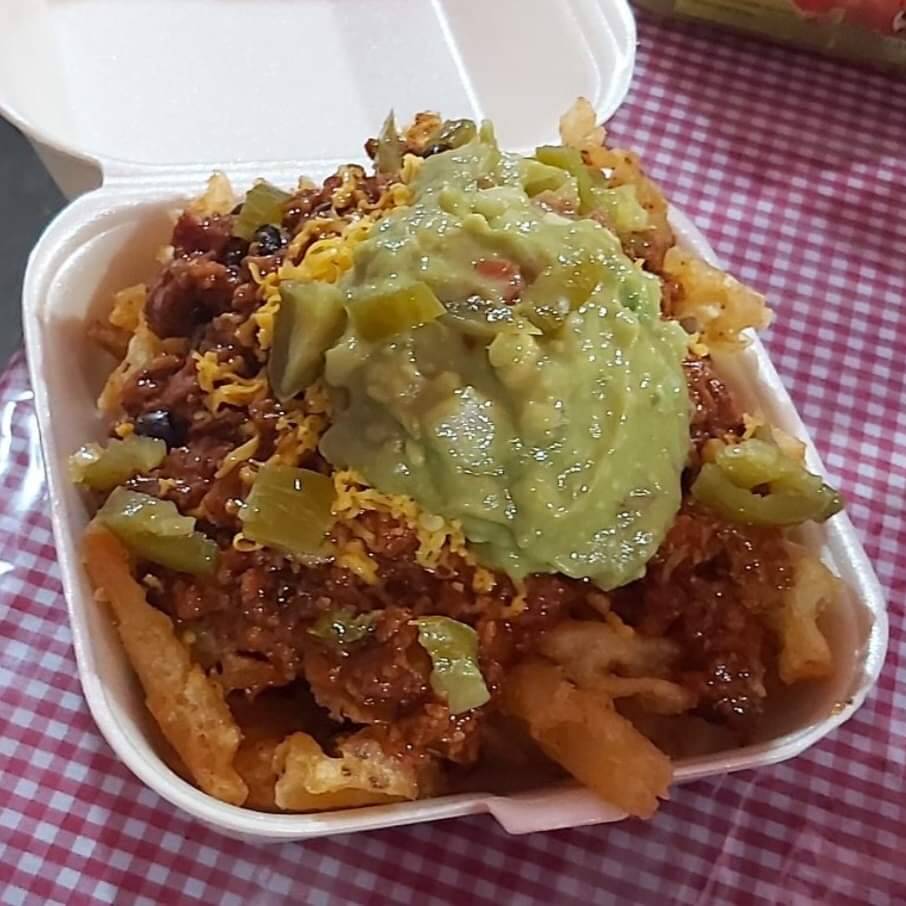 Papas a la francesa con Preparacion de Chilli (receta de la casa), acompañadas de queso gratinado.