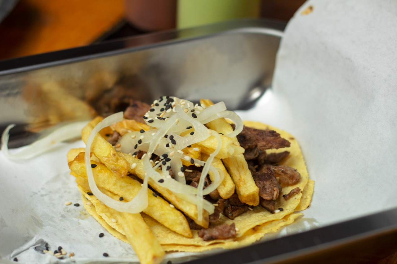 Jugosa arrachera, queso, papas fritas, cebolla, lechuga.
