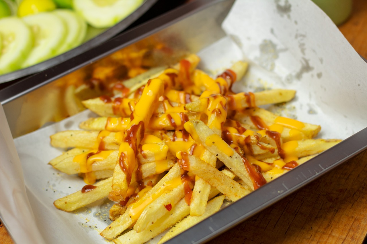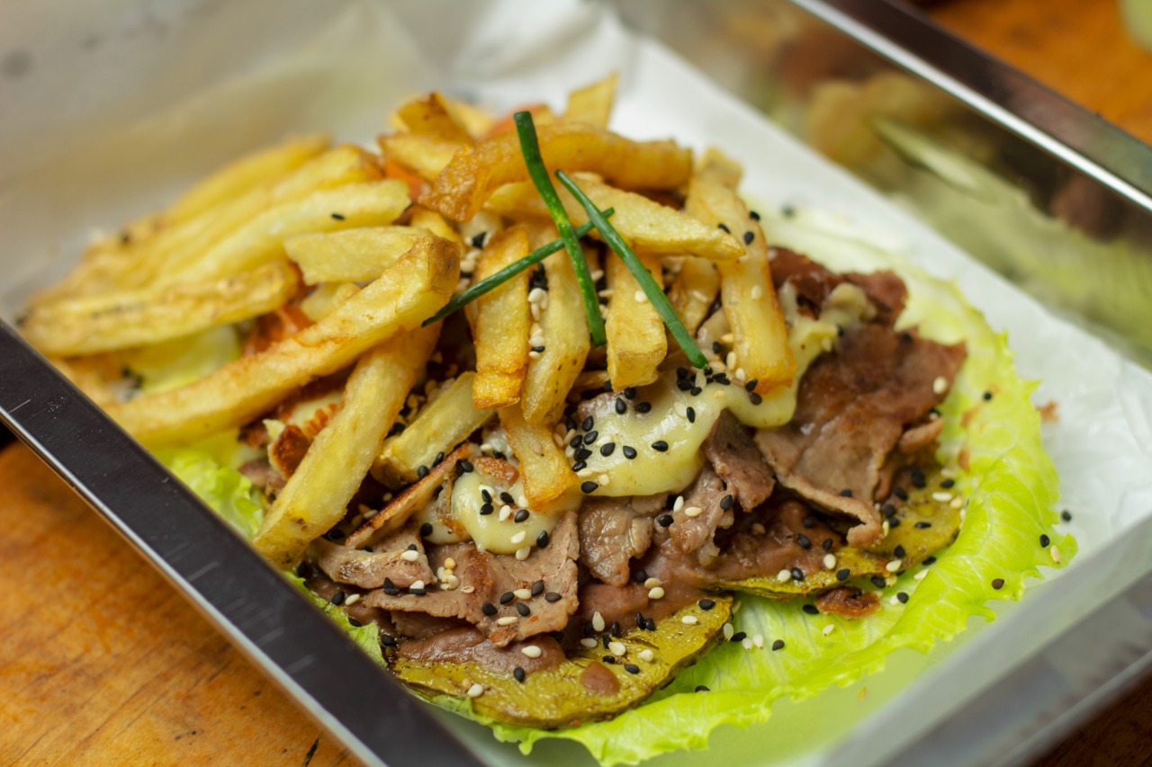 Deliciosa carne de res, jamón, quesillo, champiñones, tocino y papas a la francesa.