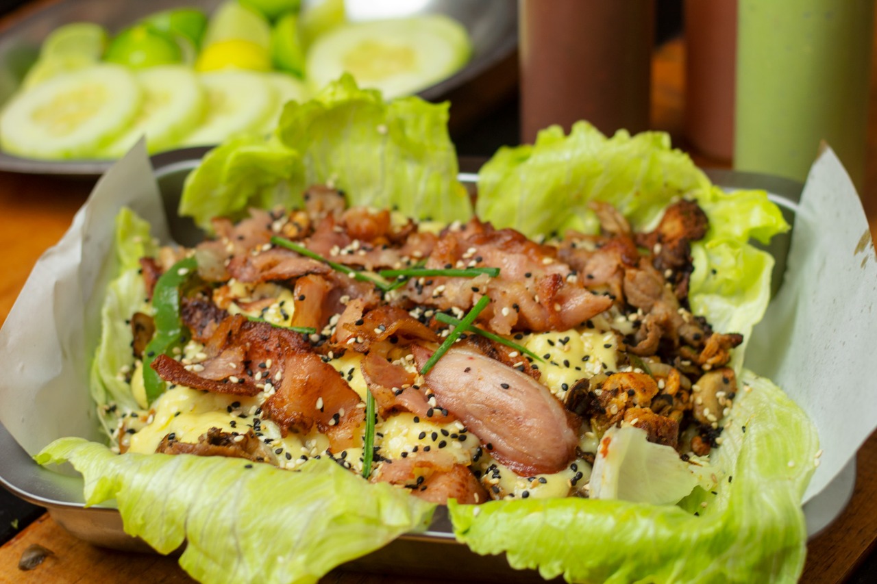 Cama de queso dorada y enrollada, rellena de carne o vegetal a escoger, servida en una cama de lechuga y acompañado con una tortilla de harina.