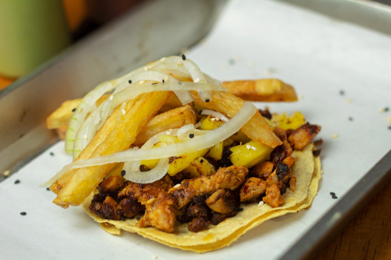 2 TACOS DE POLLO EMPANIZADO CON PAPAS Y CEBOLLA