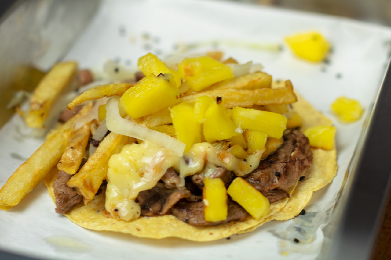 Deliciosa carne de res, jamón, queso amarillo, queso, piña y papas a la francesa.