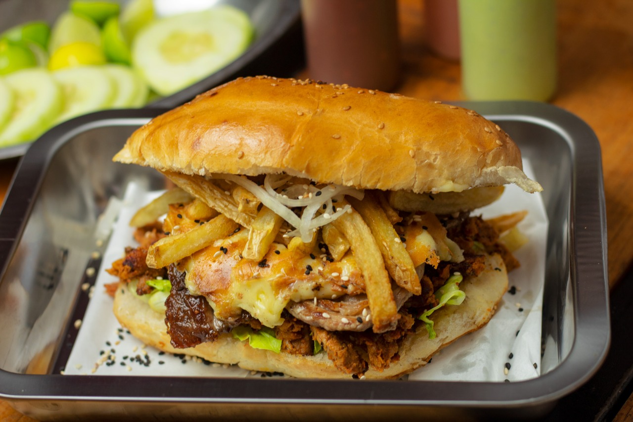Una deliciosa carne de res, carne de pollo, doble de jamón, queso amarillo, quesillo, tocino, piña y papas a la francesa.
