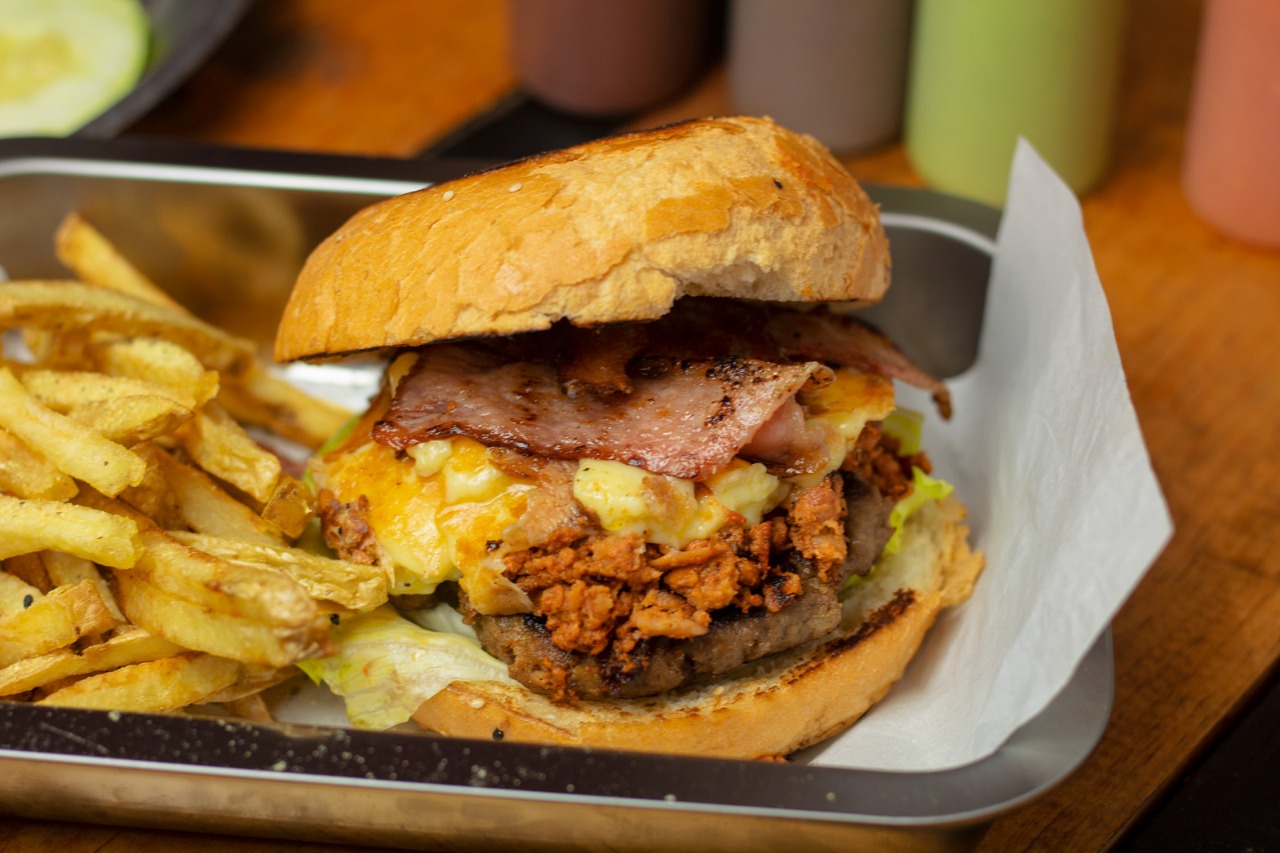 Deliciosa carne de res, jamon, doble queso amarillo, queso, tocino y papas a la francesa¡¡