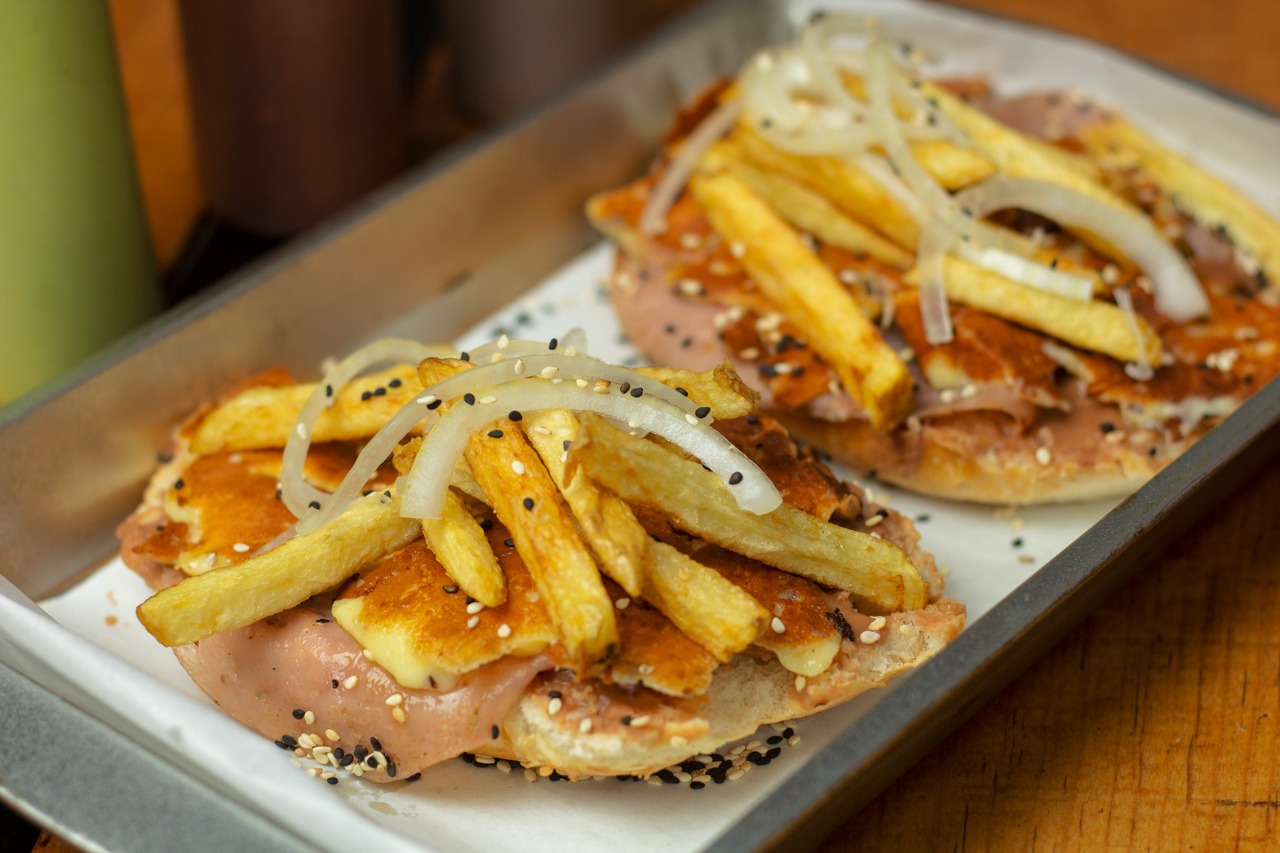 Dos deliciosas carne de res, doble jamón, queso amarillo, quesillo, tocino, champiñones y papas a la francesa.