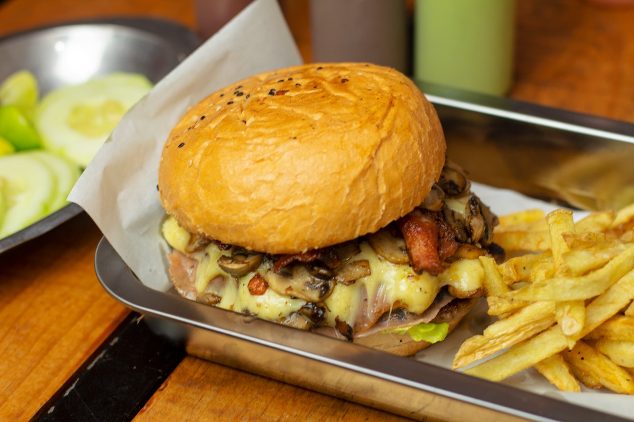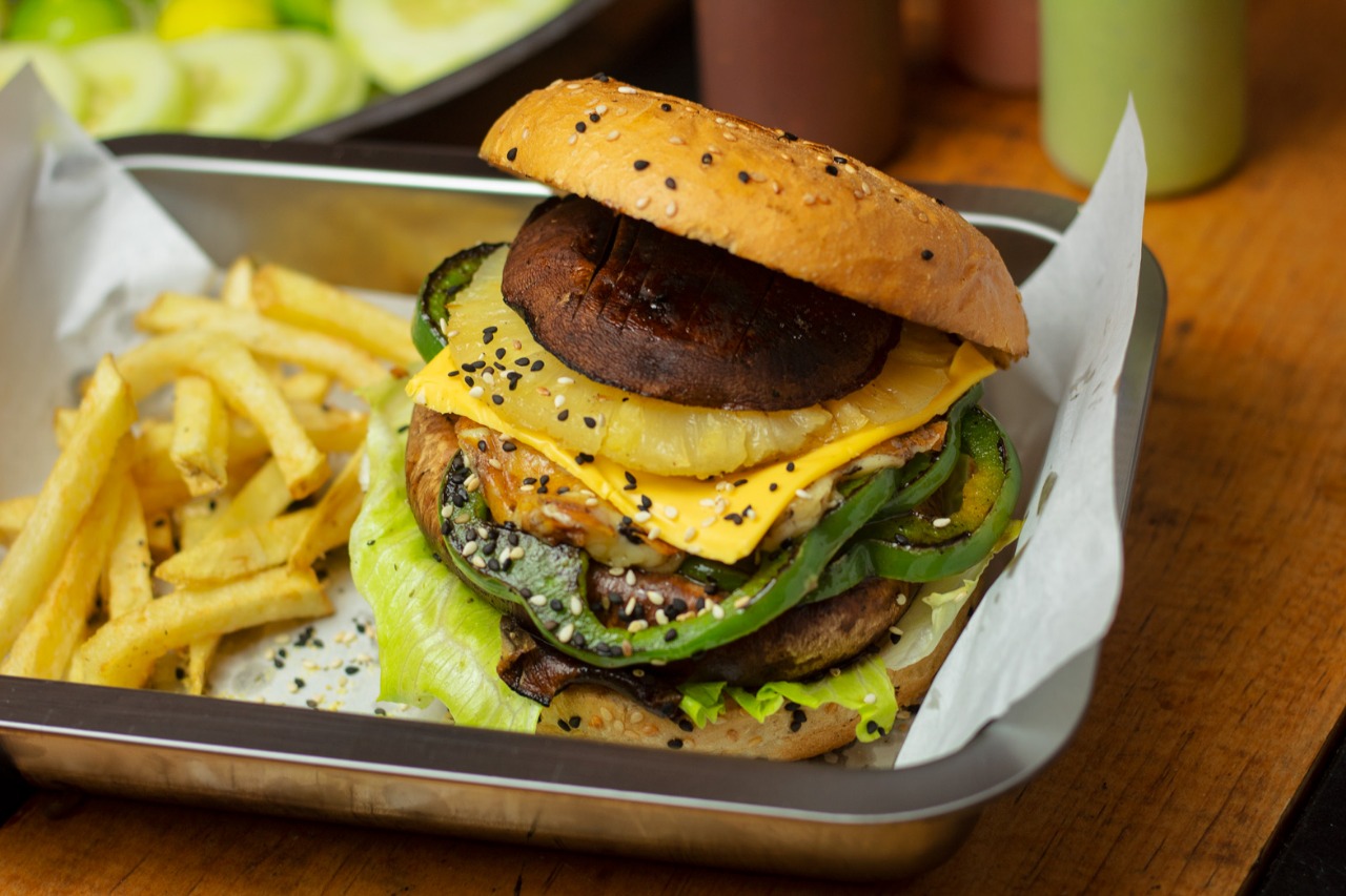 Gigante hongo portobello, con piña, doble queso amarillo, quesillo, morrón asado y papas a la francesa.