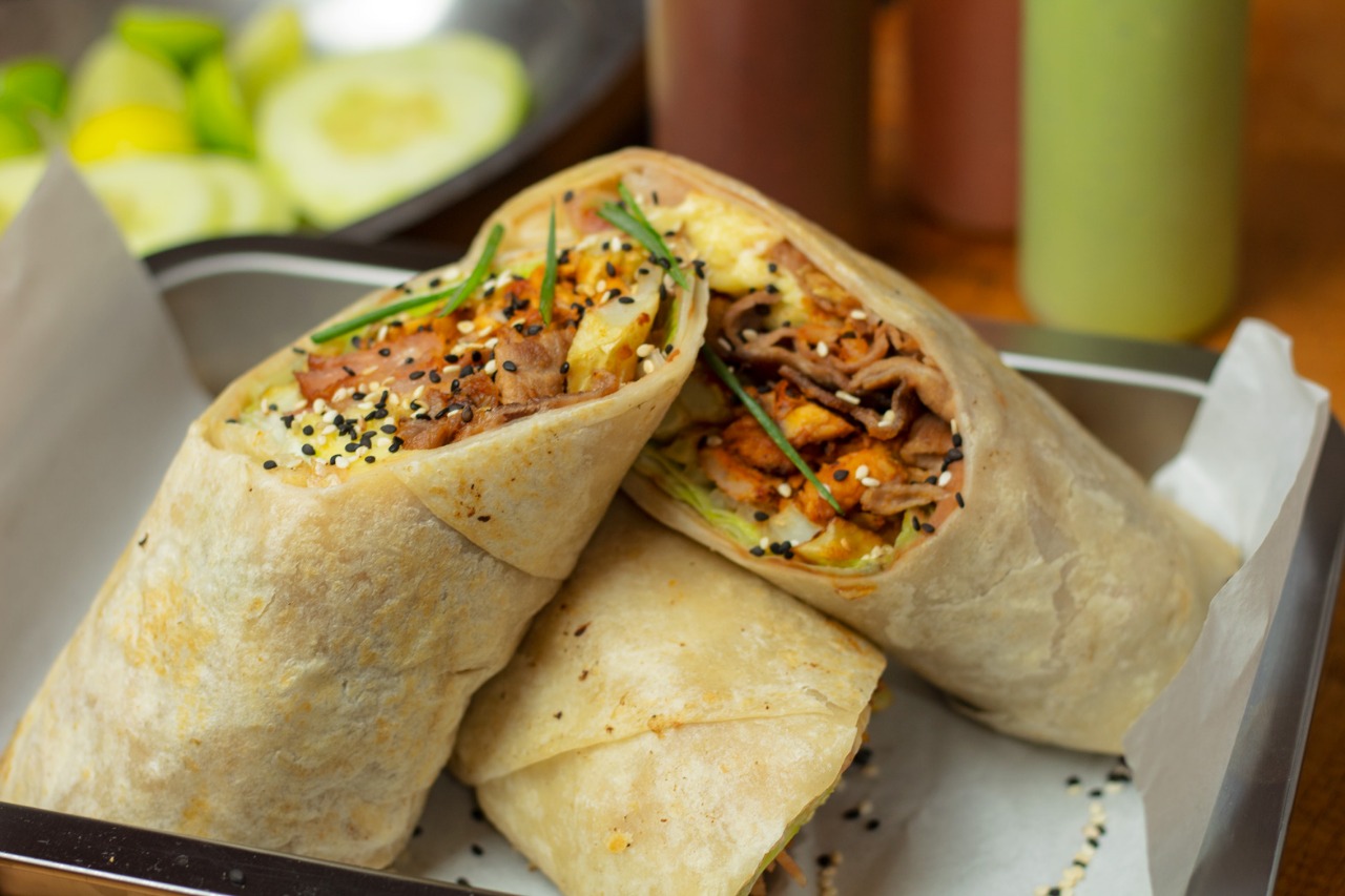 Gigante tortilla de harina delicioso bistec, pastor, tocino, queso, papas fritas, cebolla lechuga.