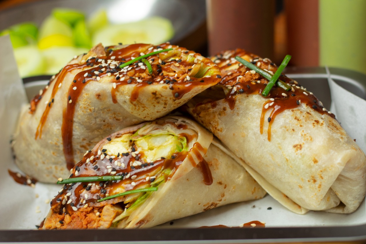 Gigante tortilla de harina deliciosa pechuga de pollo, queso, papas fritas, cebolla lechuga.