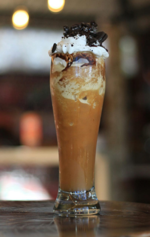 Bebida a base le leche, hielo, café de especialidad, chocolate intenso y crema batida