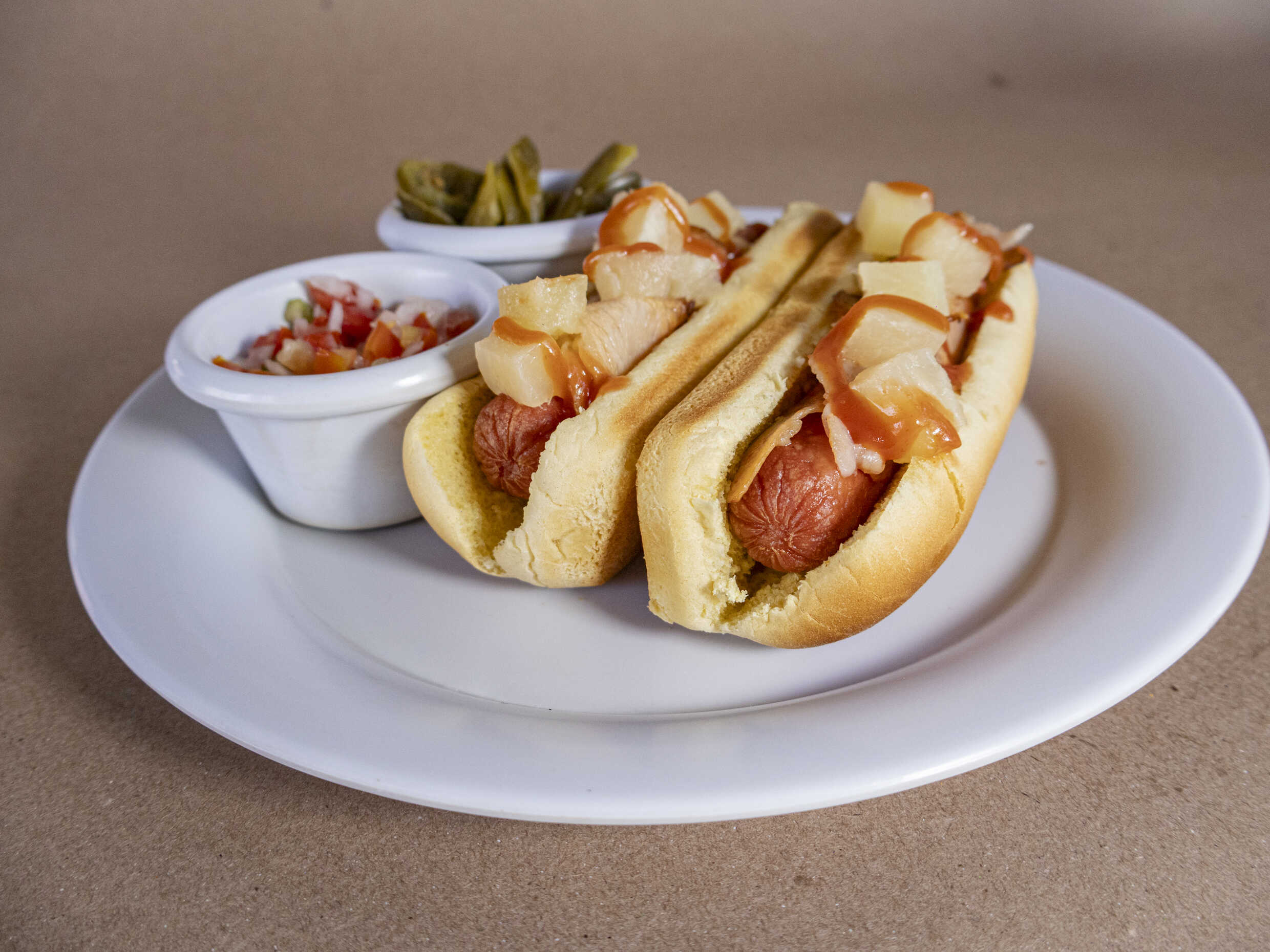 Salchicha de pavo, piña, tocino, mayonesa acompañados de salsa mexicana.