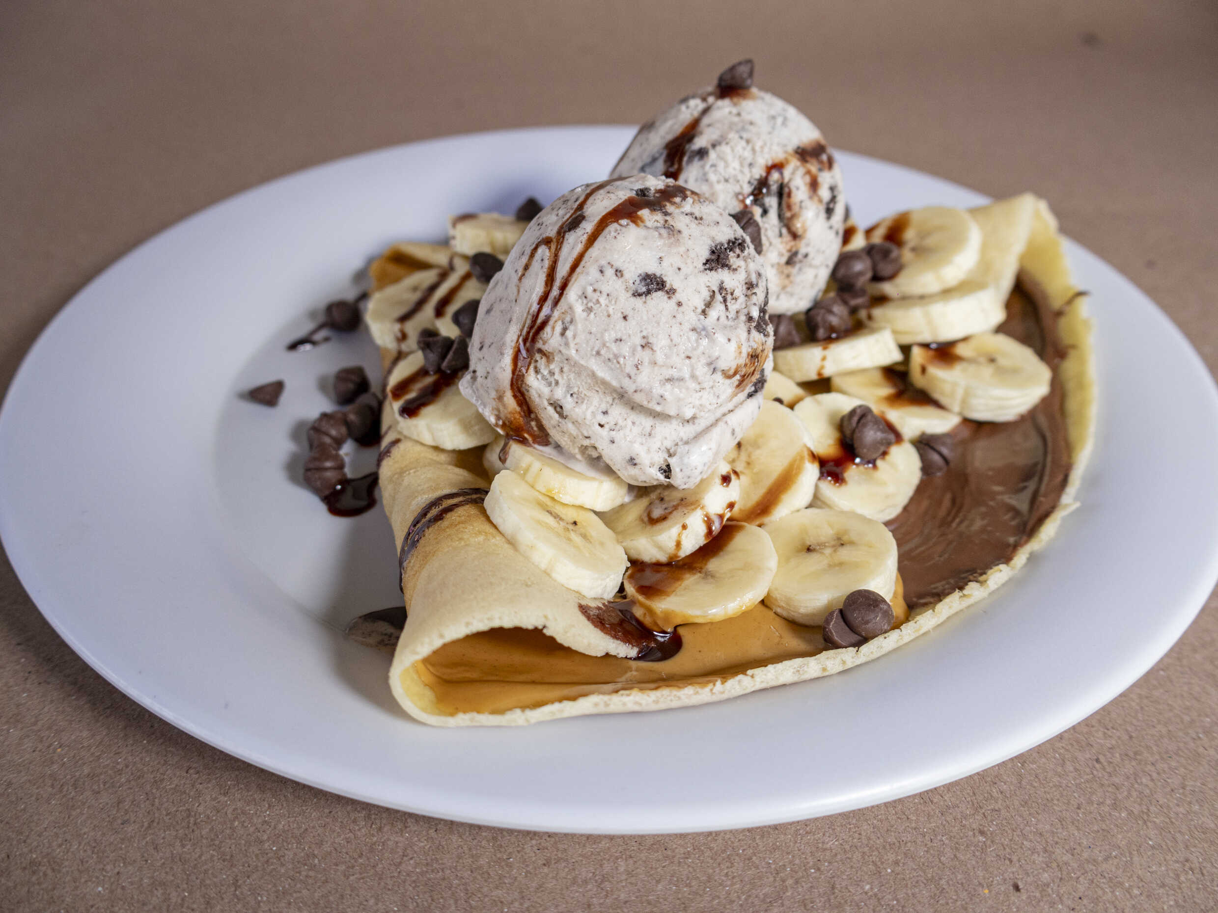 Nutella, crema de cacahuate, plátano, cajeta, chispas de chocolate y helado de galleta.