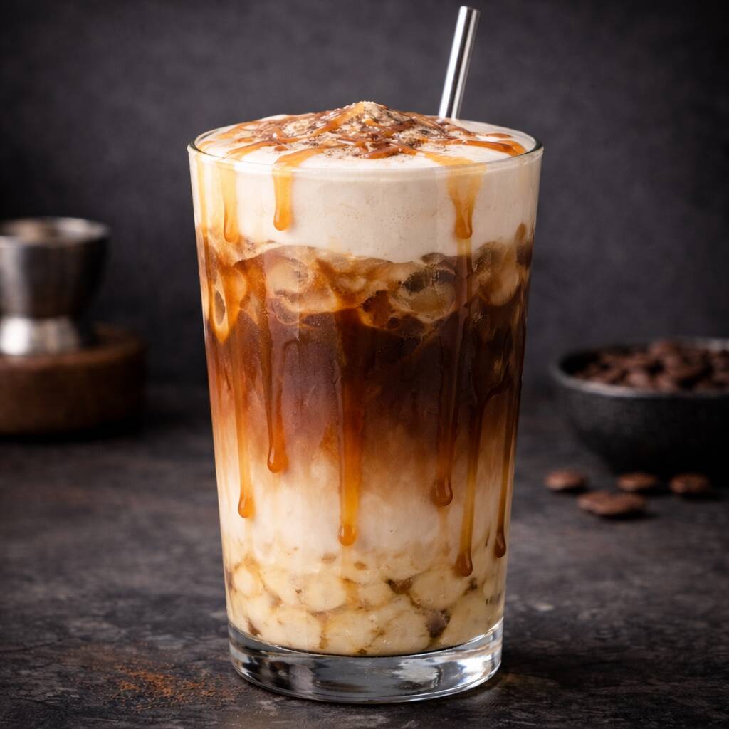 Leche fría con espresso de especialidad y caramelo gourmet, servido sobre hielo y coronado con una cold foam espesa y cremosa