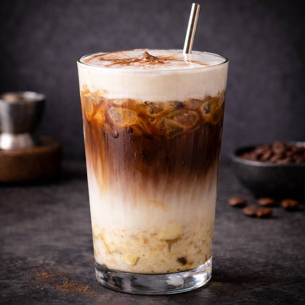 Mezcla suave de banana natural, lechera y canela en el fondo, leche fría y un shot de espresso de especialidad, servida sobre hielo con notas cálidas y dulces