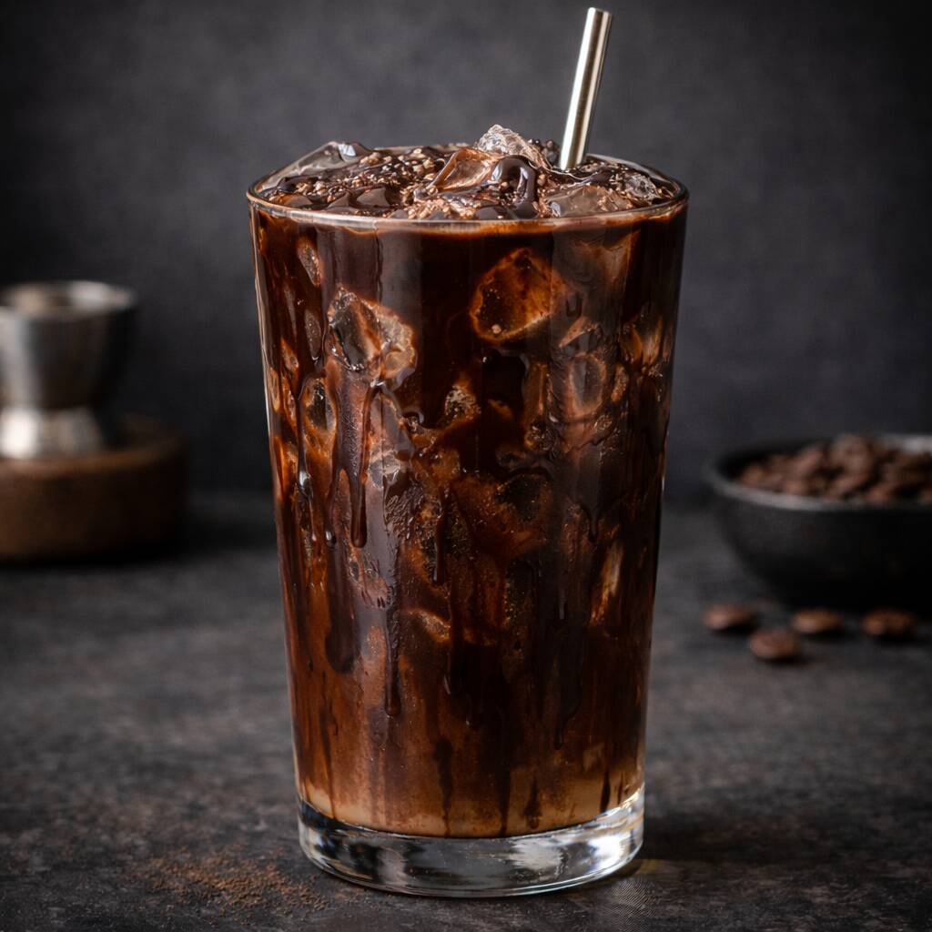 Espresso de especialidad con chocolate semiamargo, servido sobre hielo, intenso y profundo, pensado para quienes disfrutan el café fuerte con notas de cacao real.