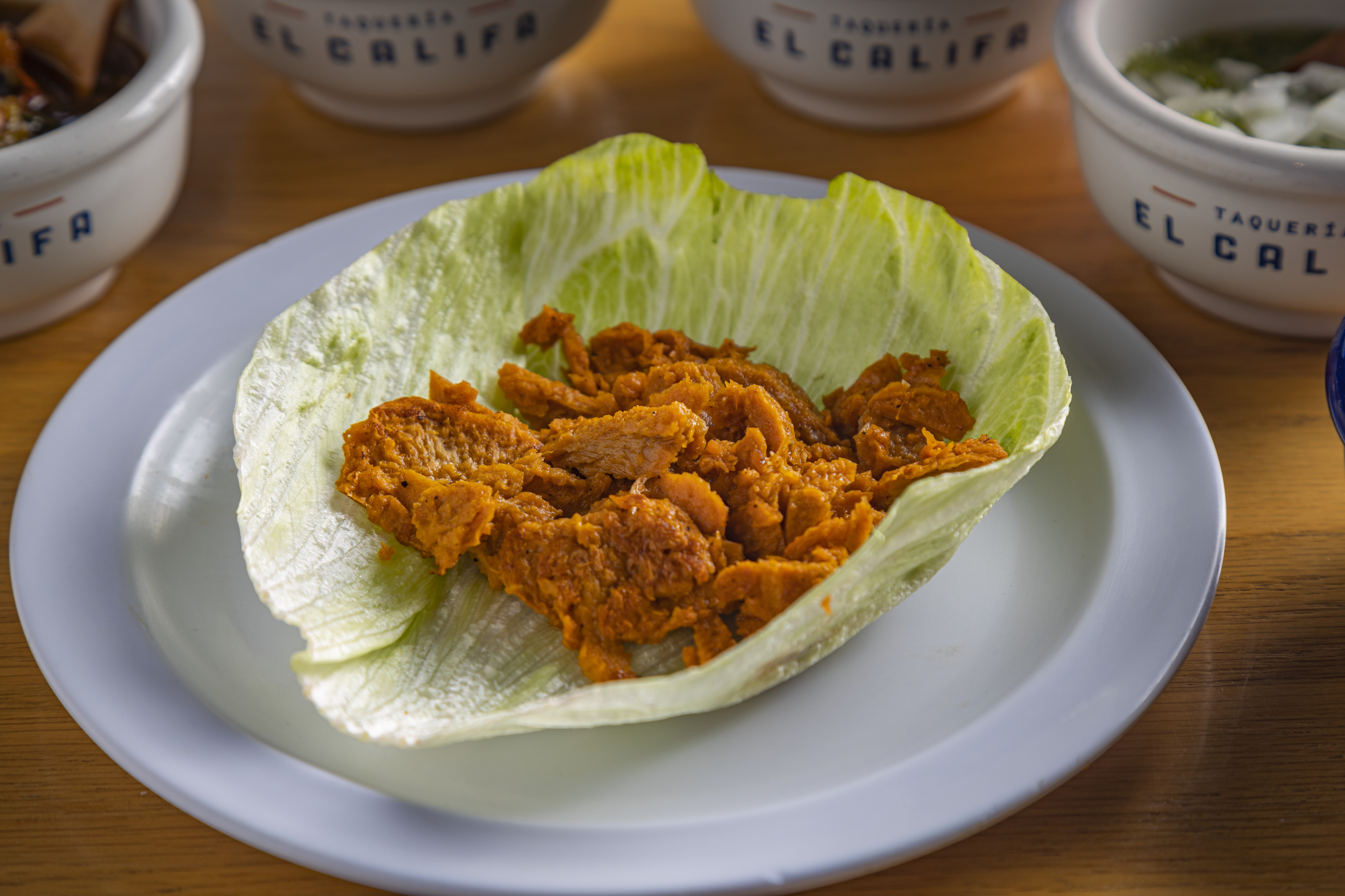 80 g Pastor vegetariano (producto a base de soya y gluten marinado) servido en una hoja de lechuga Los complementos cebolla, cilantro y piña se envían por separado