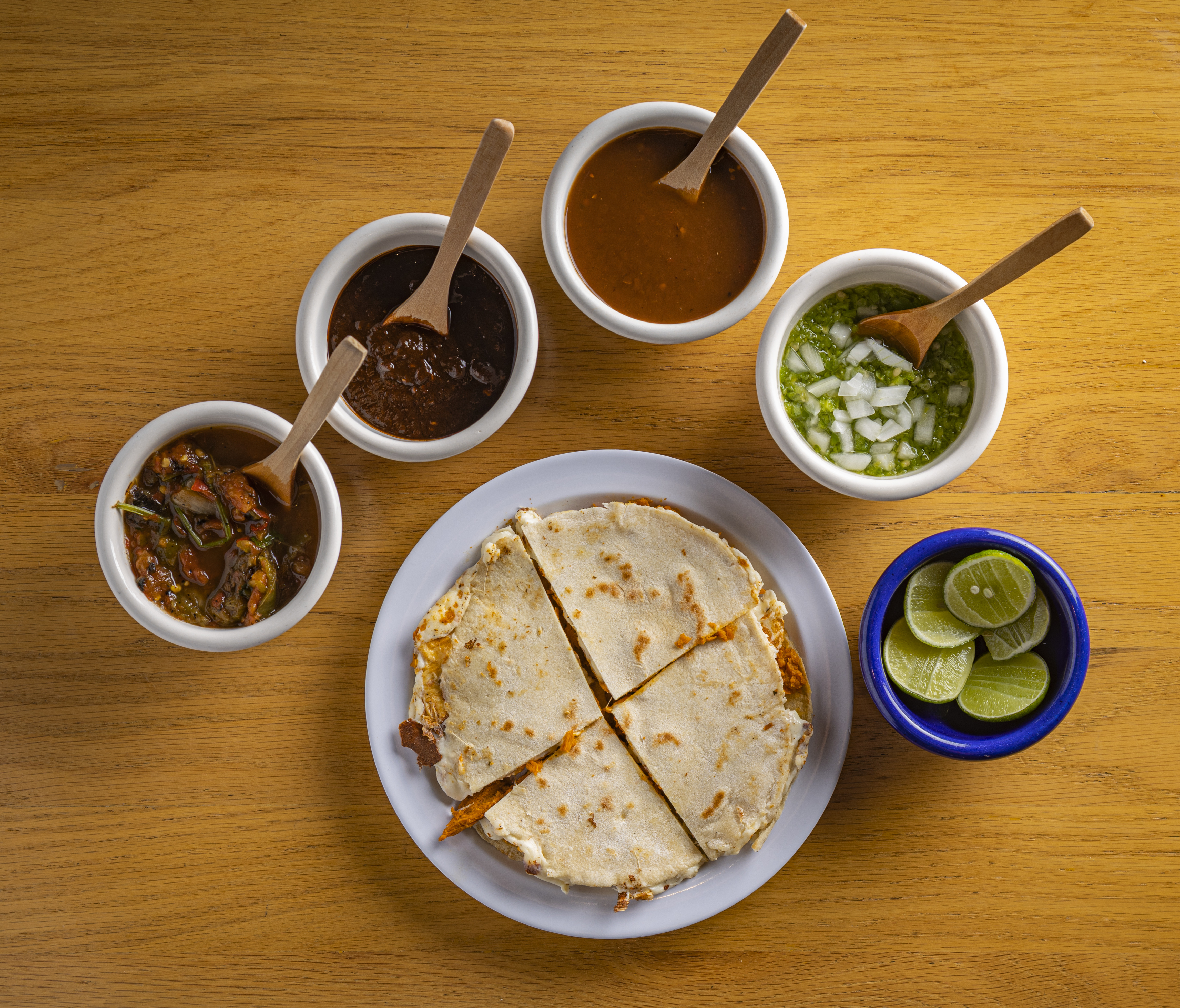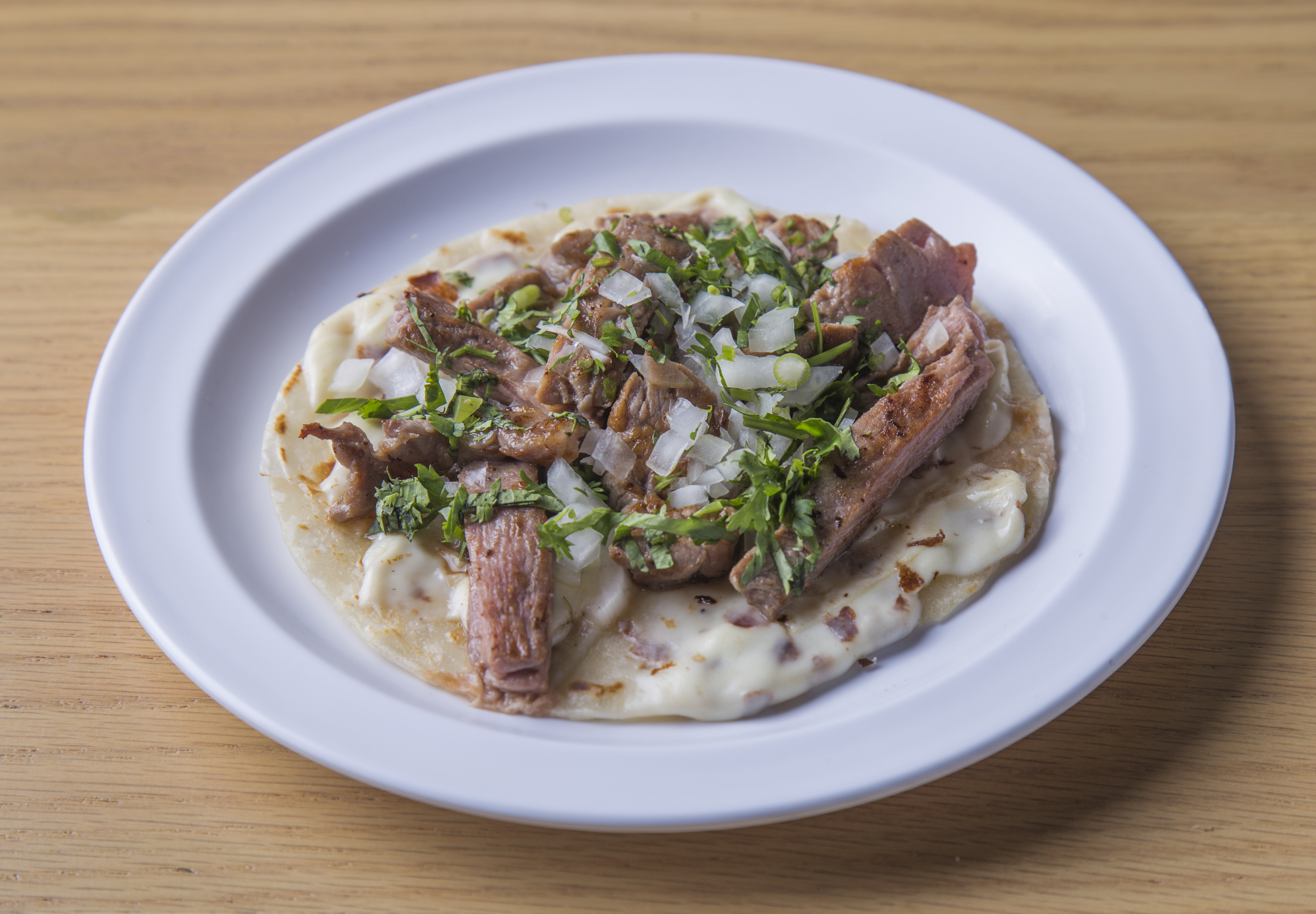 110 g Arrachera suave y jugosa fileteada servida en una tortilla de harina con una base de queso oaxaca. Los complementos cebolla y cilantro se envían por separado