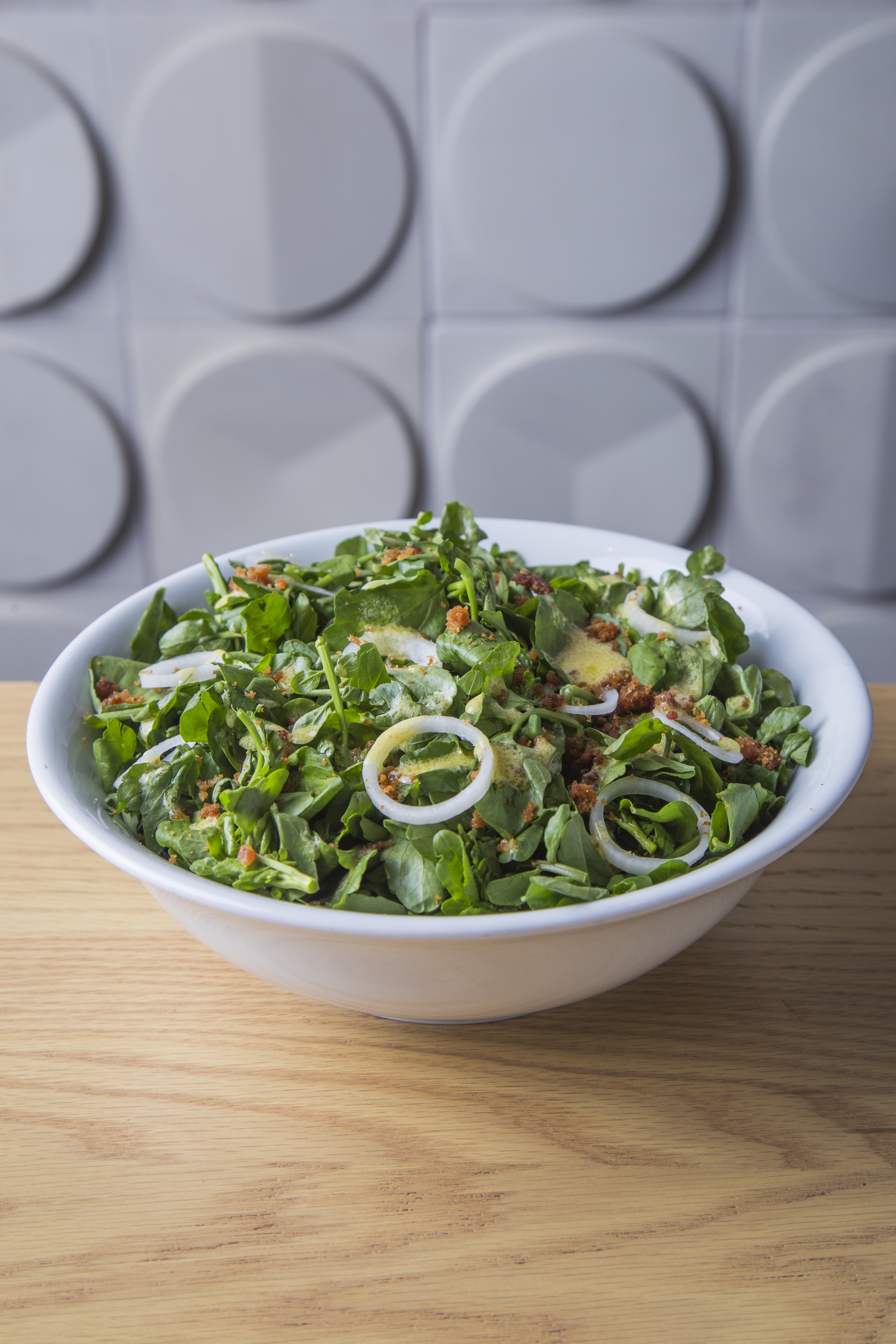 160 g Servidos con aros de cebolla de cambray, tocino y chile serrano picado, aderezado con vinagreta de mostaza