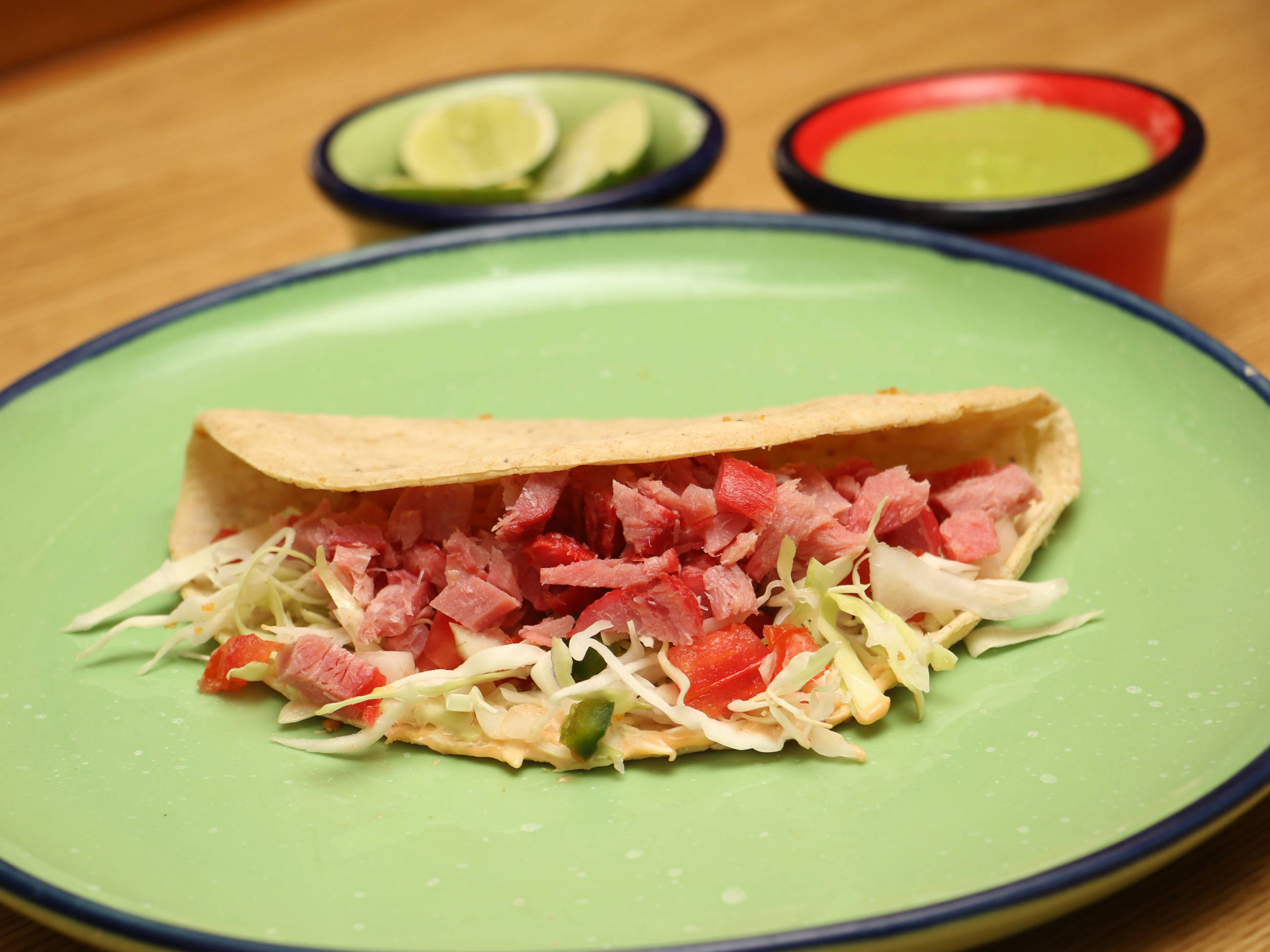 Delicioso marlin ahumado sobre una cama de col, pico de gallo en tortilla de maíz con aderezo de mayonesa.