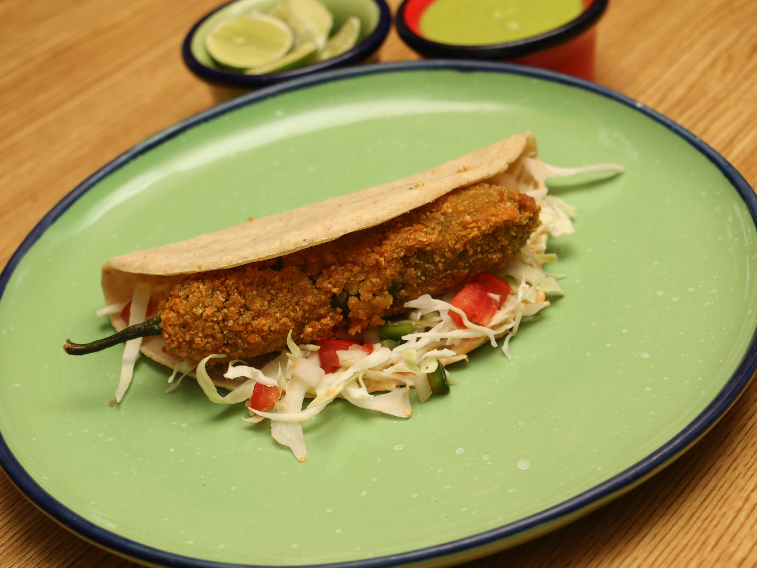 Delicioso jalapeño relleno de camarón y queso sobre una cama de col, pico de gallo y aderezo de mayonesa con chipotle.