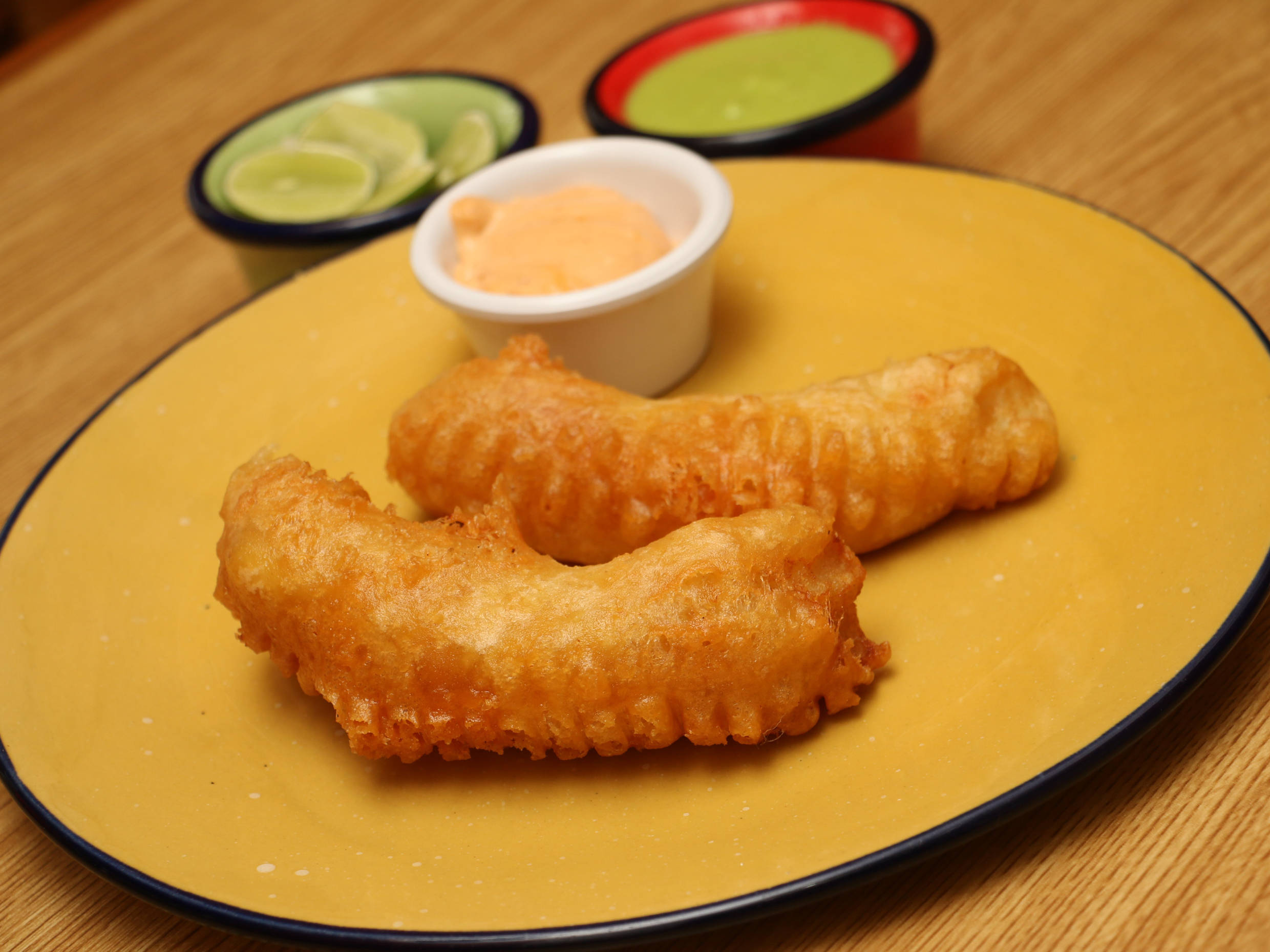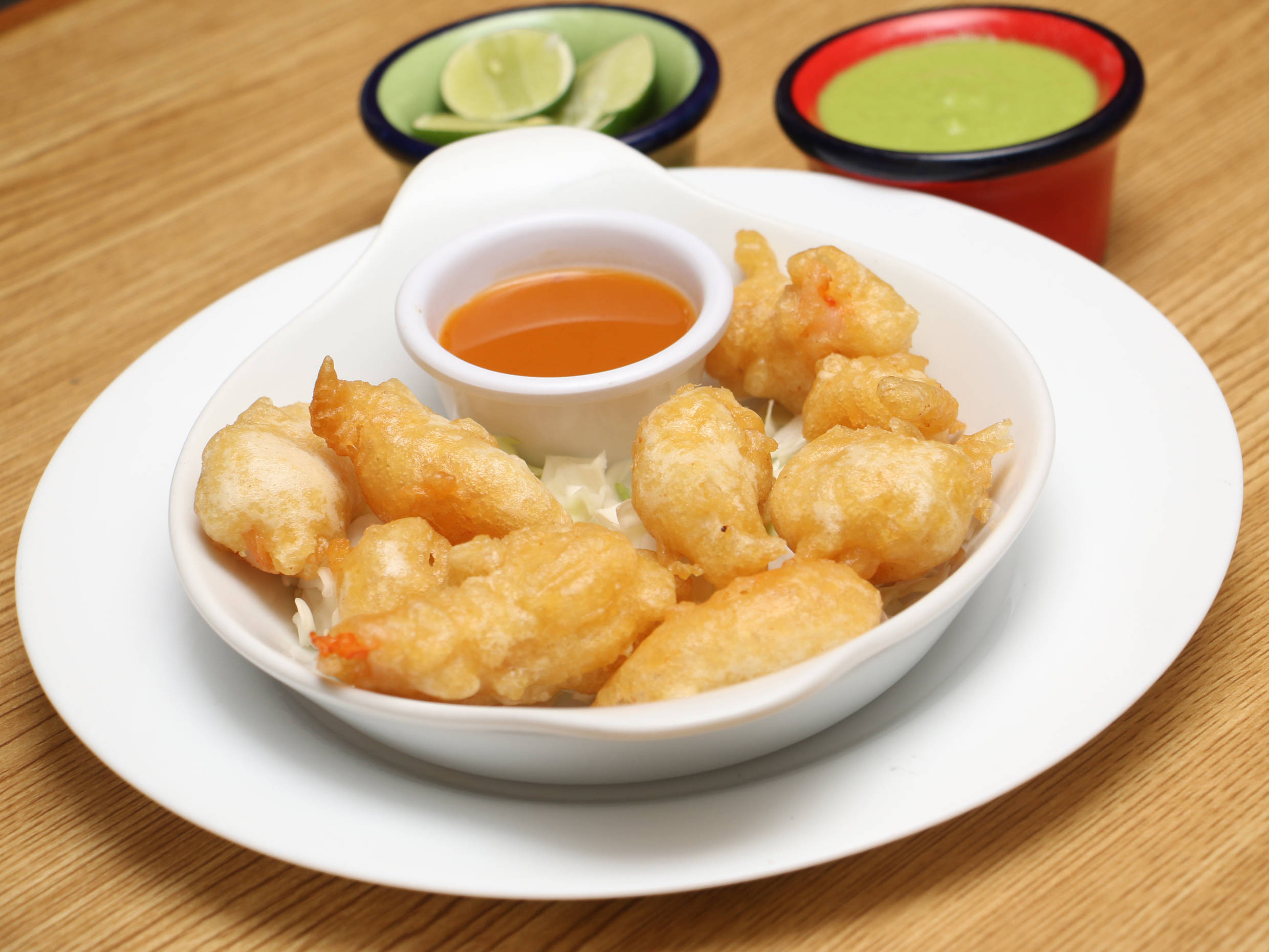 Deliciosos camarones rebosados acompañados con salsa de mango agripicante.